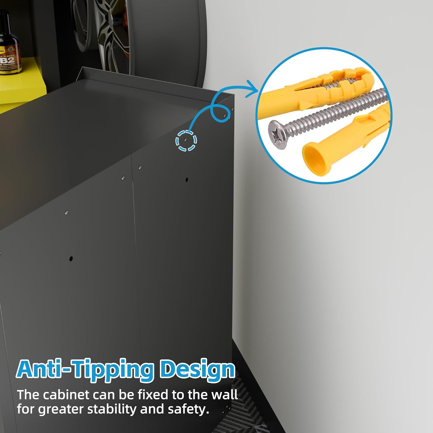 - [Keep Items Secure] The steel cabinet's lockable doors keep your tools and equipment safe and organized, maximizing your storage space in small areas.The top 3 sides of our metal storage cabinet feature sturdy fences that prevent items from falling out.
