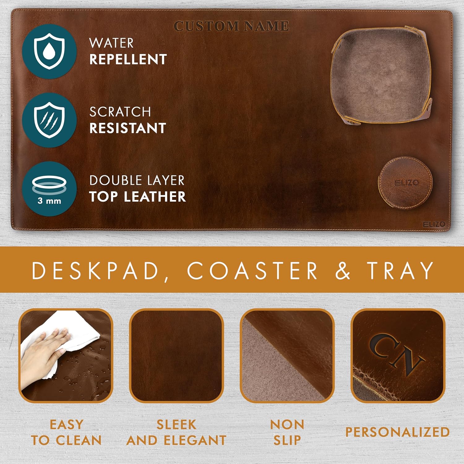 - PREMIUM LEATHER & PERSONALIZED ELEGANCE – Elizo’s genuine full-grain leather desk pad set is meticulously crafted using an oil wax tanning process, ensuring a luxurious texture and lasting durability. Personalize this large desk mat to make it a unique statement piece—perfect for your office or as a distinctive leather gift.
