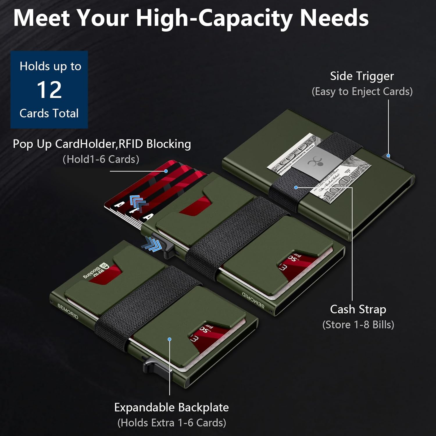 Slim Aluminum Card Holder Wallet for Men, Durable Expandable Backplate, RFID Blocking Minimalist Metal Pop Up Wallet, Holds 12+ Cards Plus Cash