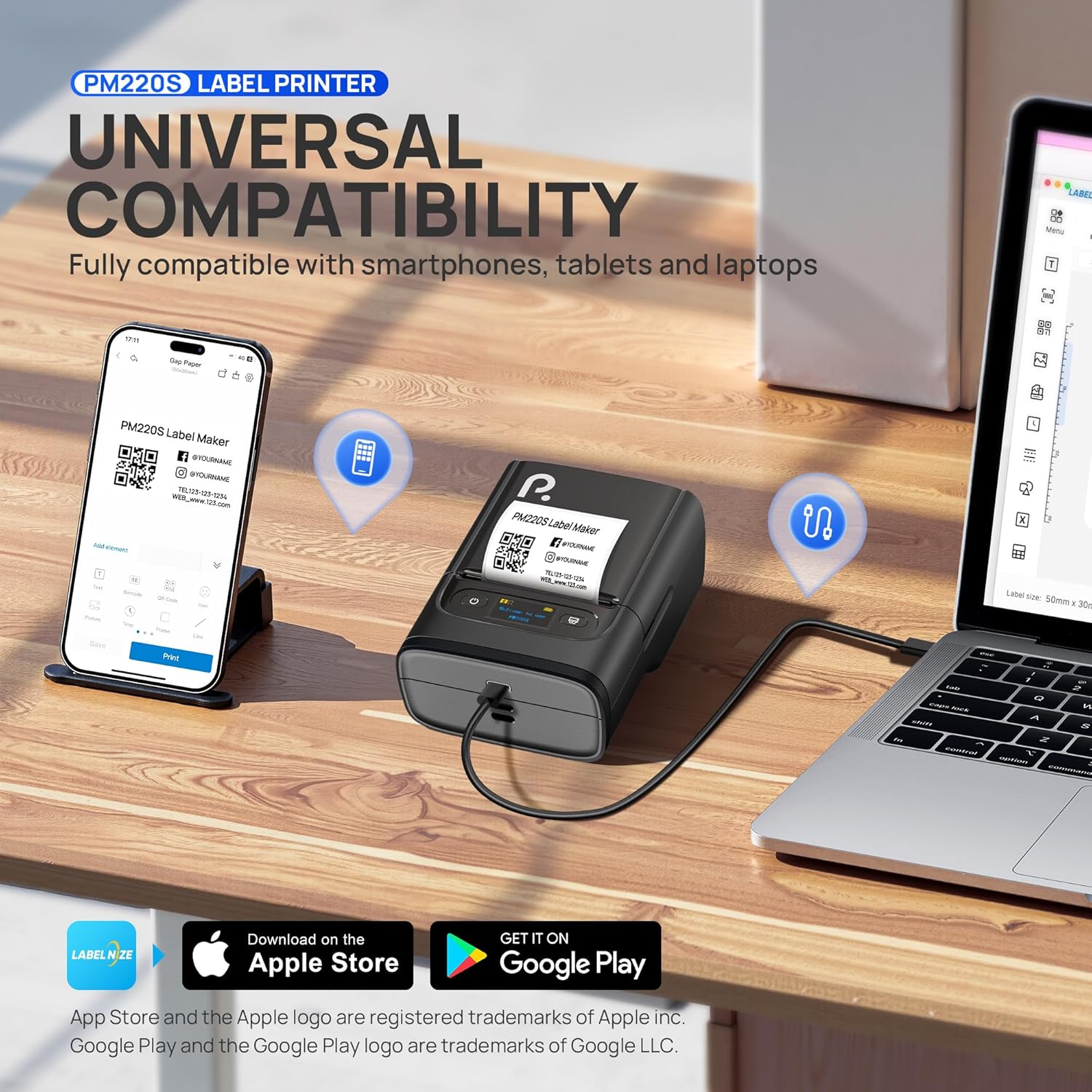 - 【Powerful APP】PM220S label maker machine with tape comes with free label templates and can set up your own templates.The thermal printer allows you to customize and format labels, supporting various features such as QR codes, Barcode Labels, Tables, Materials, Time, Figures,Ttext, Icons, etc. This label printer APP included more than 90 +Fonts, 14+ Languages, 450+ Material.Tips: We recommend using our specialized labels for a better printing experience. Please do not tear or destruct the green sticker on the back of the specialized label strip, otherwise it will affect the printing effect.