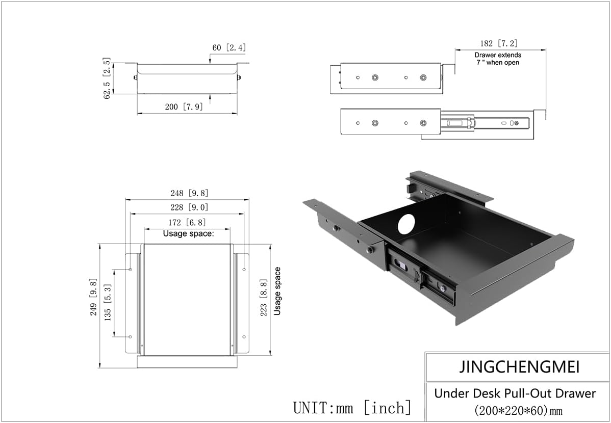 - Convenient Under-Desk Storage: Exterior dimensions after assembled-Width 7.9" (W 9.8" including side brackets ) x Depth 9.8" (including the handle) x Height 2.5". Inside Usage Space: W 6.8" x D 8.8" x H 2.4" . This sliding pull-out drawer mounts under your desk (at least 0.75β thick) , providing easy access to stored items while keeping your workspace clutter-free.