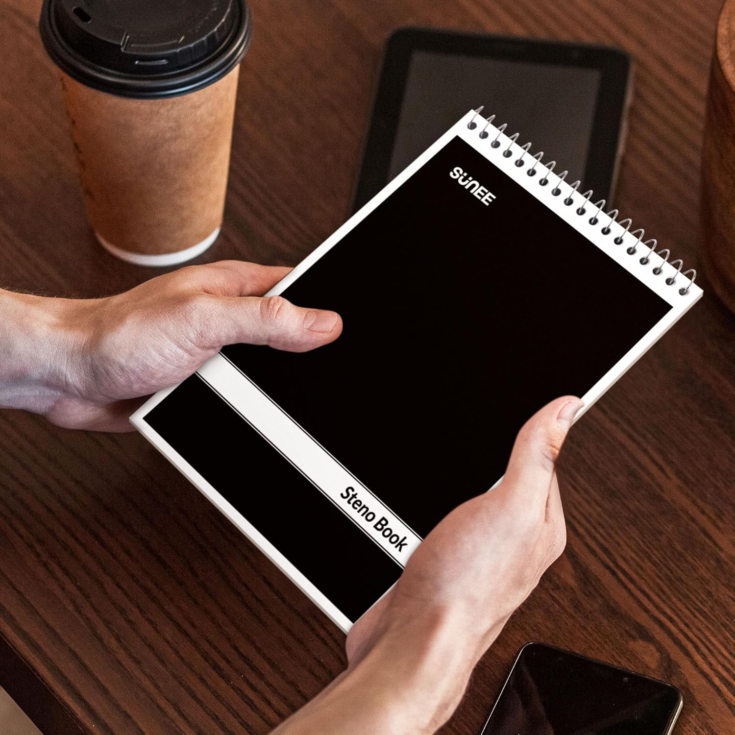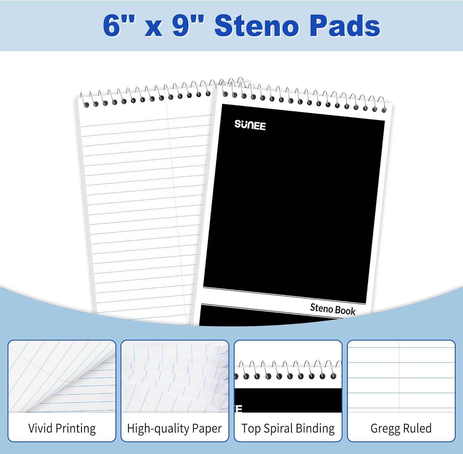SUNEE 12 Pack Steno Pads 6x9, Gregg Rule, 60 Sheets, Spiral Notebook 6x9, White Paper, Take Notes with Top Spiral Notebook, for School, University, College, Work, Office, Black
