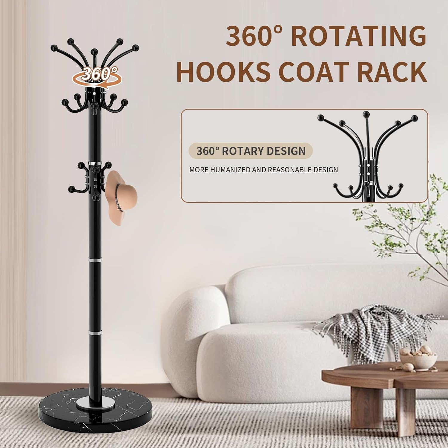 Modern Metal Coat Rack Stand, Coat Rack Freestanding with Natural Marble Base, 360°Rotary Design Sturdy Coat Racks with 16 Hooks, White Coat Hall Tree Stand for Entryway (Black)