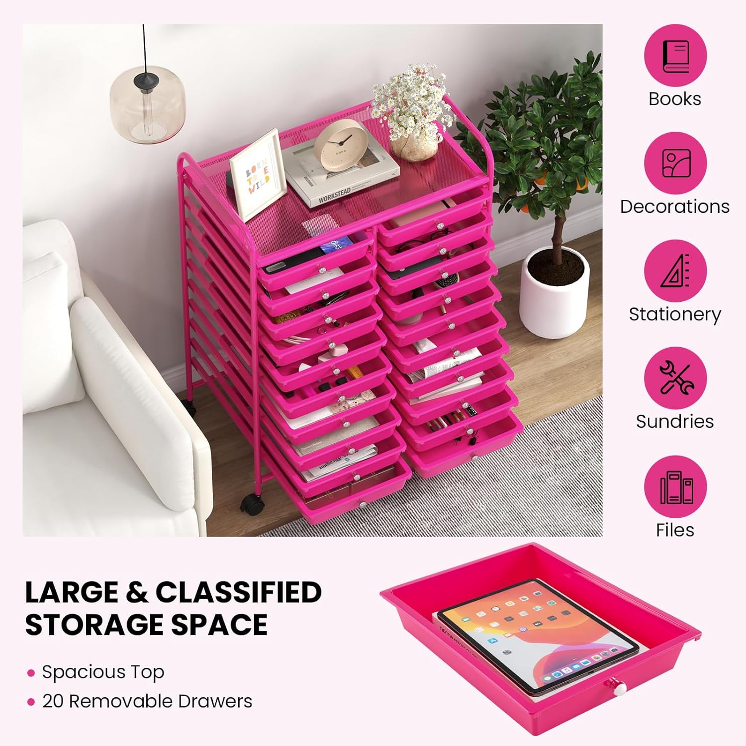 Giantex 20 Drawers Rolling Cart, Mobile Storage Drawer Cart, Classroom Organizer for Office School Supplies Teacher Tools Scrapbook Paper Craft Small Printer, Utility Stand on Wheels, Hot Pink