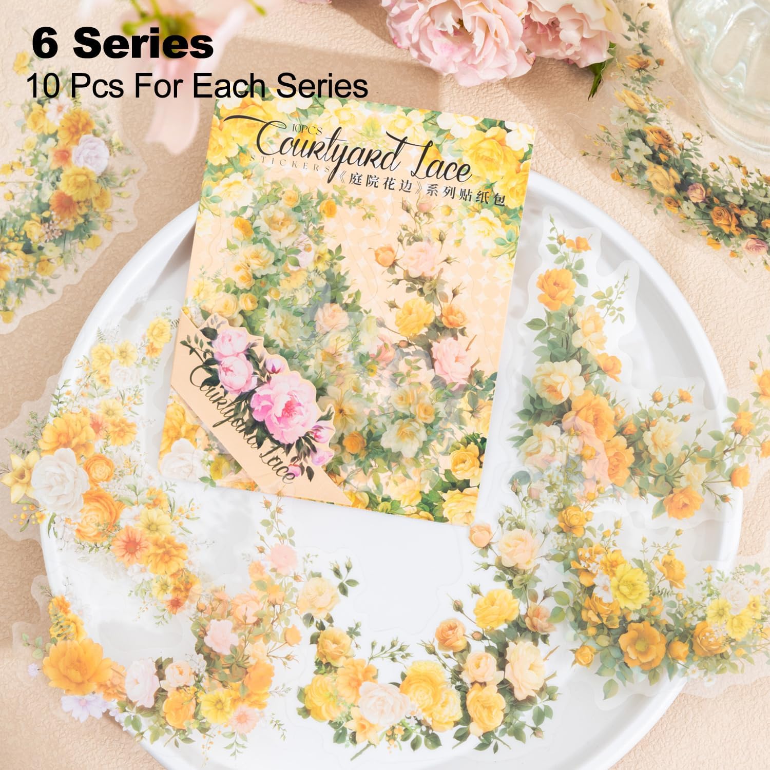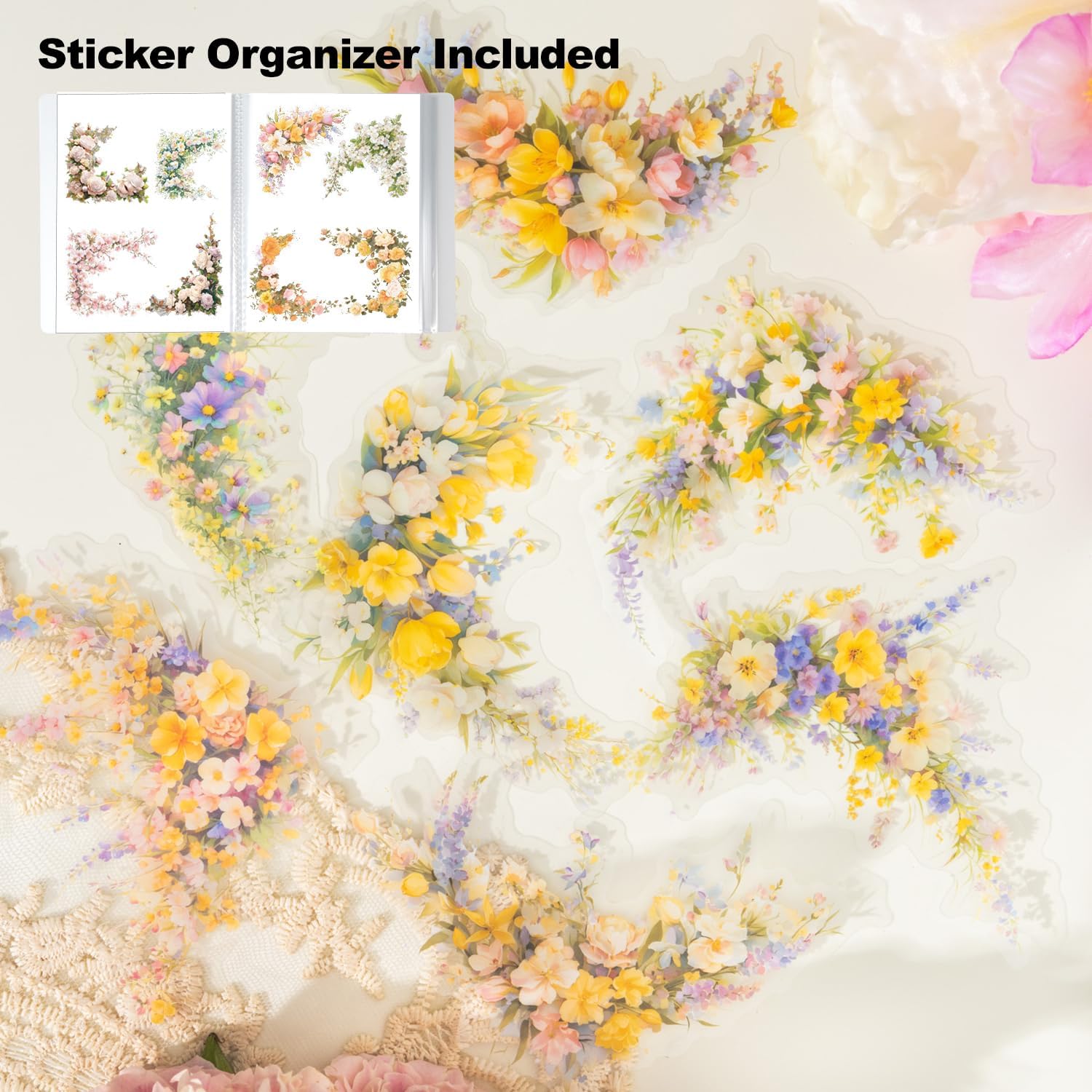 60 Pcs Vintage Flower PET Stickers Set, Large Floral Corner Stickers for Scrapbooking, Journaling, DIY Crafts, with Organizer