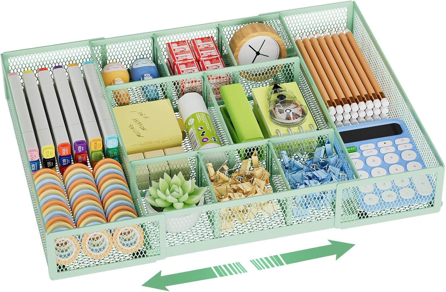 Marbrasse Expandable Desk Drawer Organizer, Mesh Drawer Organizer Tray with 10 Adjustable Compartments, Desk Organizers and Accessories for Office Supplies, Makeup & Vanity (Expandable-Green)