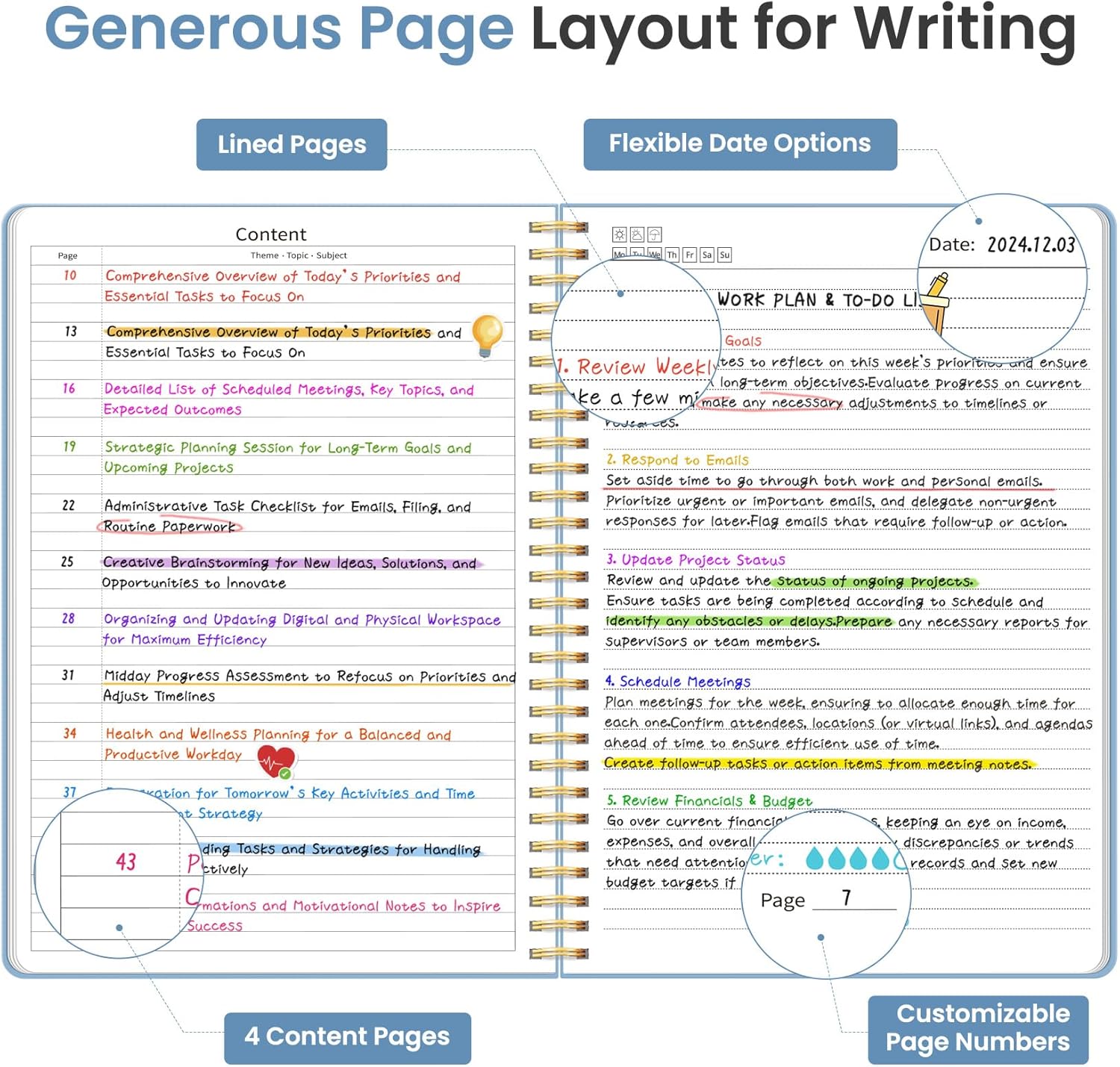 - Customizable Pages & Table of Contents: Includes 4 table of contents pages to keep your notes organized and easy to reference. Contains 50 sheets/100 lined pages that allow you to write on both sides, each page allows you to customize page numbers and dates, making it the ultimate notebook for you.