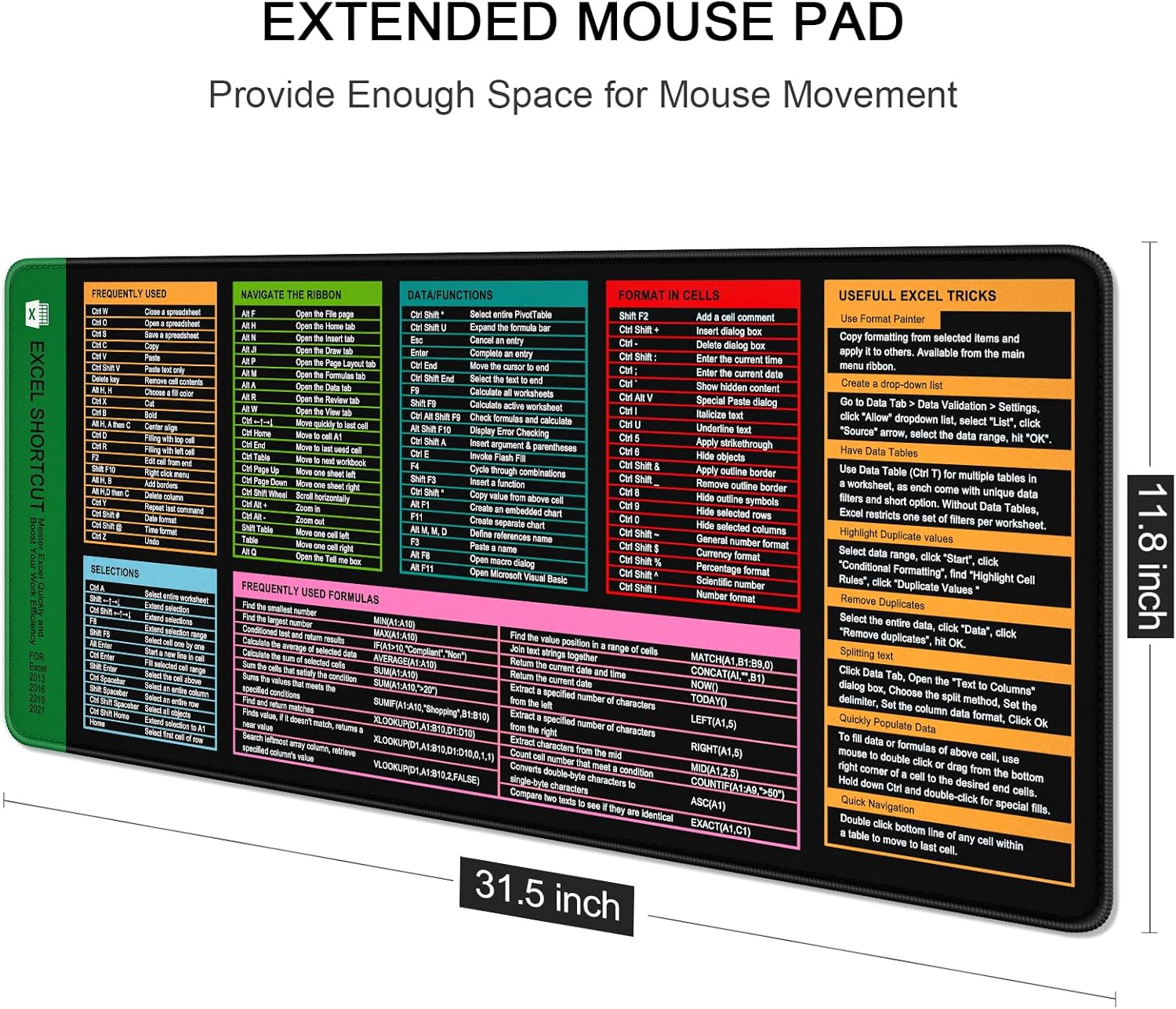 Auhoahsil Large Mouse Pad, XXL Gaming Mousepad, Desk Mat for Desktop, Thick Rubber, Big & Long Size, Stitched Edges, Full Desk Pad for Laptop & Computer, Extended 31.5 x 11.8 in, Excel Shortcut Keys