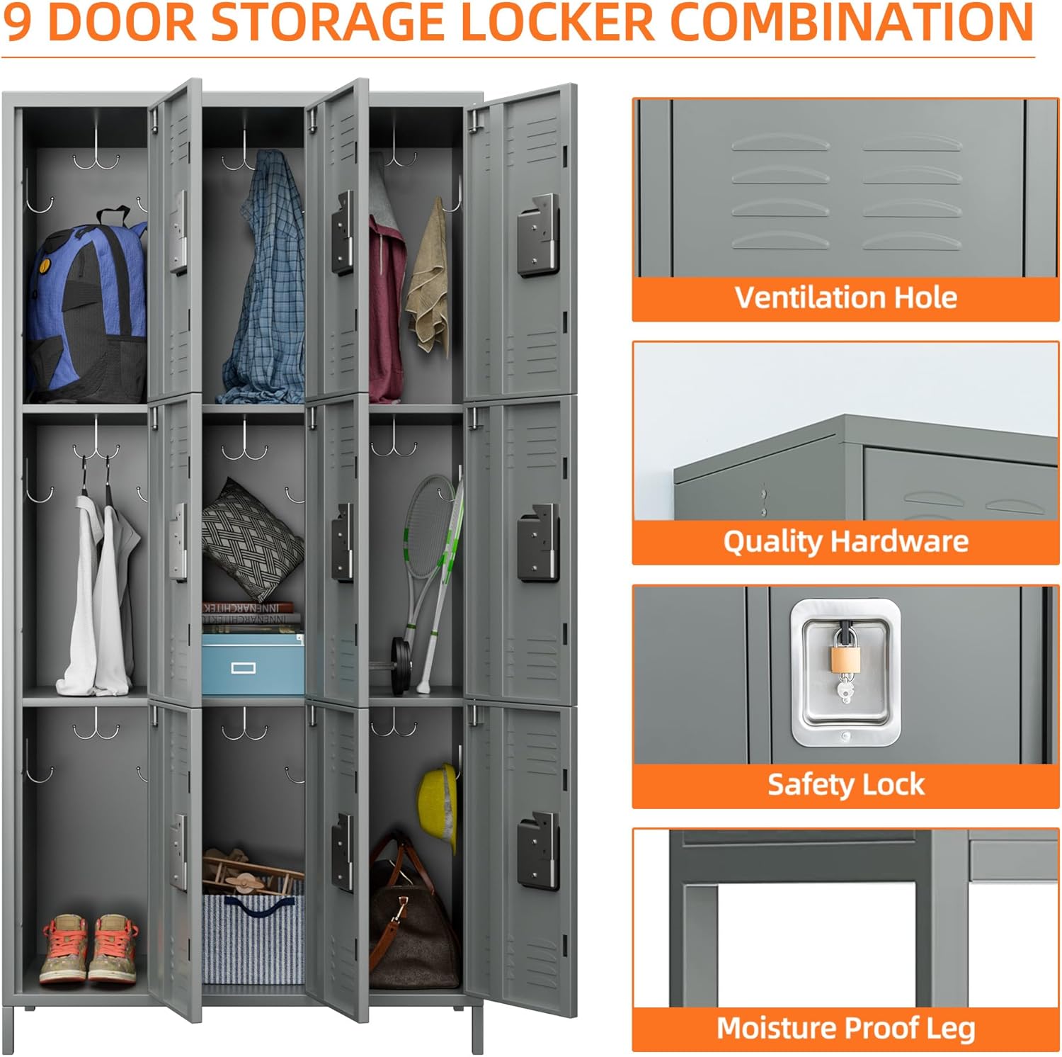 - [Combination Lockers]:9 doors metal locker are equivalent to nine separate cabinets together, more storage space, Metal Lockers for Employees with 27 hooks, it can meet your needs for storing different sized items and meet most of your daily needs.