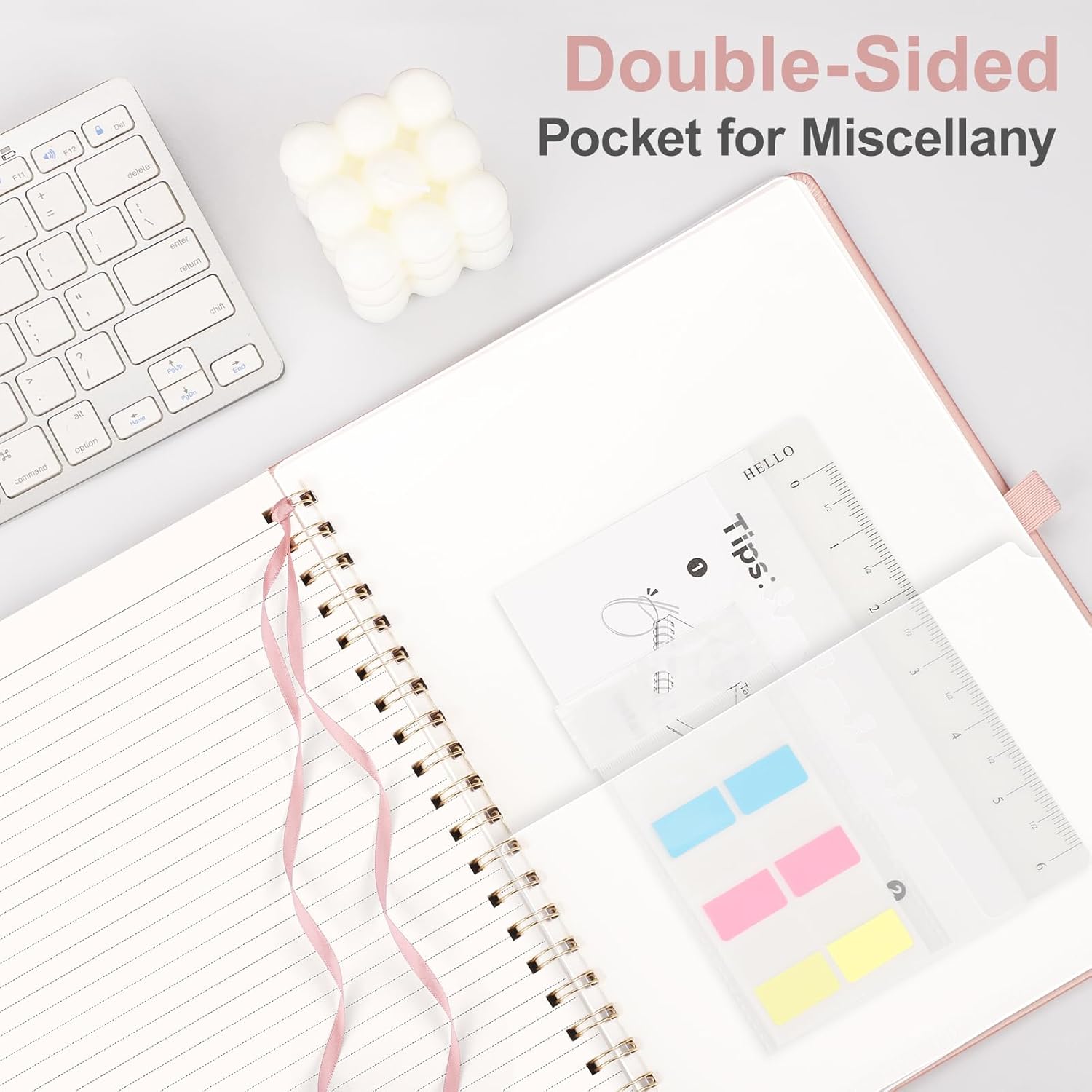 - PRACTICAL LAYOUT: Equipped an elastic band, a pen holder and removable bookmark ruler to keep your notebook organized. Comes with a DIY bookmark with a ribbon for self-attachment to the spiral, serving as a bookmark. Features a double-sided pocket for storing miscellany and 18pcs sticky notes for additional organization and reminders