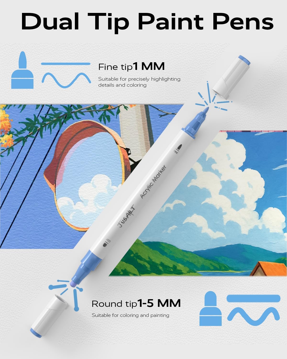 - ăDual Tip Acrylic Paint PensăJusArt Acrylic Paint Markers feature a versatile dual tip design with a 1-5mm round tip for thick lines and a 1mm thin tip for details. Perfect for outlining and filling, these markers are ideal for artists of all levels, from beginners to professionals. The smooth-flowing ink is ready to use without pressing or shaking.(Tip: Always keep the pen capped and stored horizontally to preserve the ink quality.)