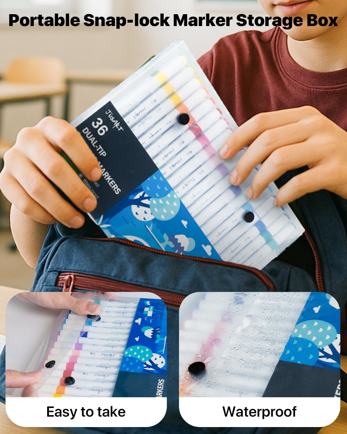 - ăDurable Waterproof Storage BoxăThe durable snap-shut case used for our acrylic markers keeps your markers organized. The reinforced design protects your painting supplies, while the transparent shell allows easy access to a variety of colors at all times, making it an ideal choice for creative professionals and amateurs