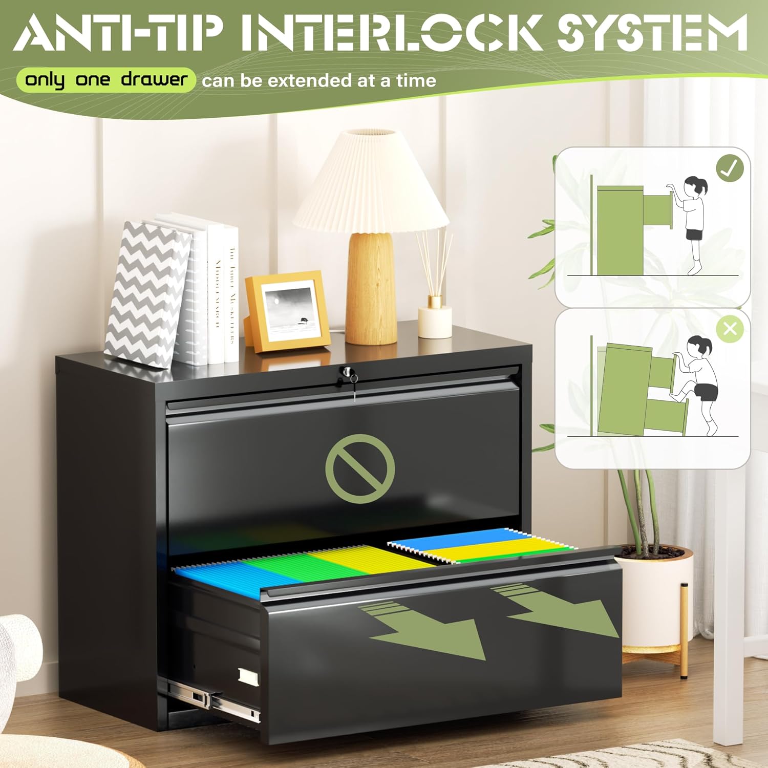 Crownland Lateral File Cabinet with 2 Drawers, 28" W Metal Lockable Office File Cabinets for Home Office- Stores Letter/Legal/A4/F4 Files(Black)