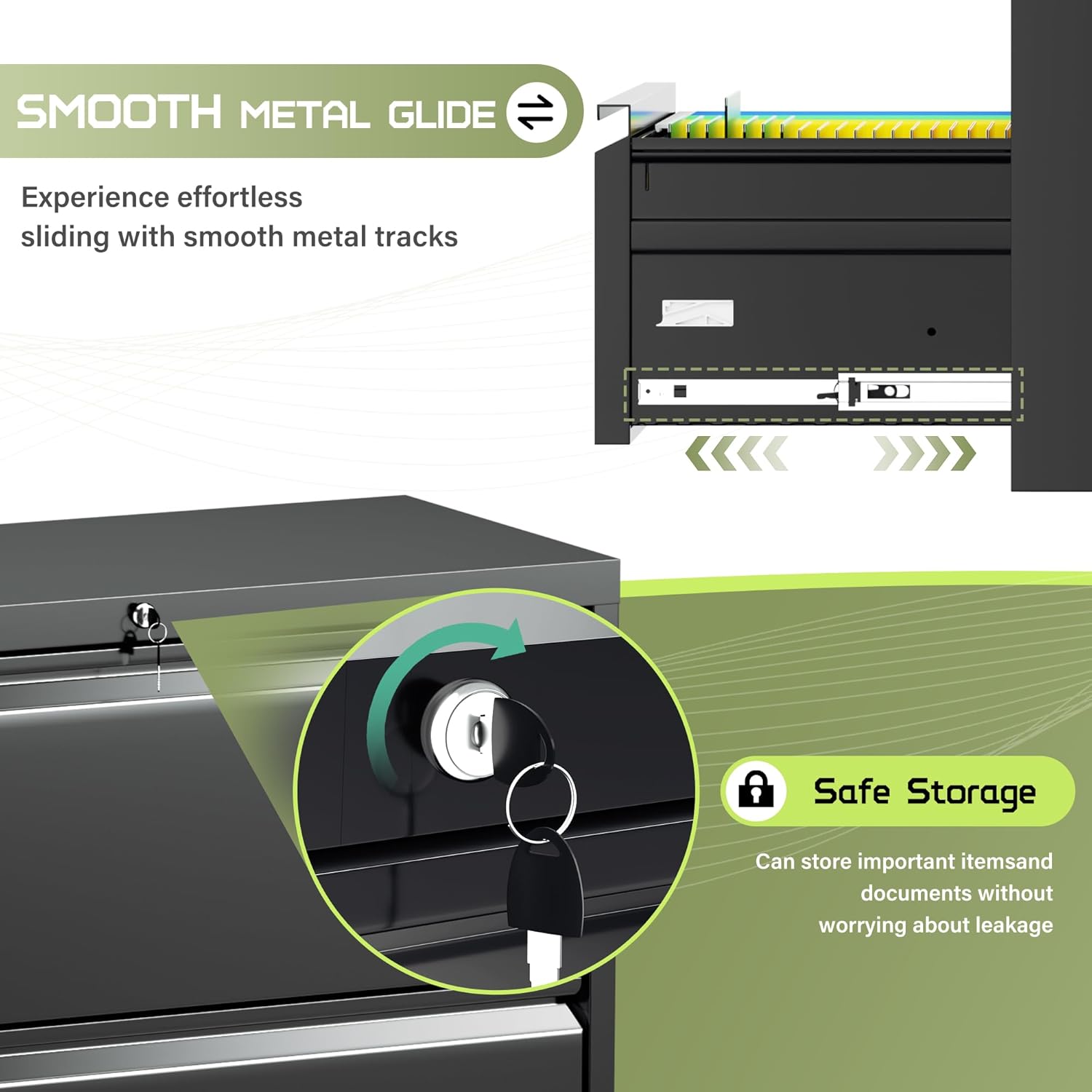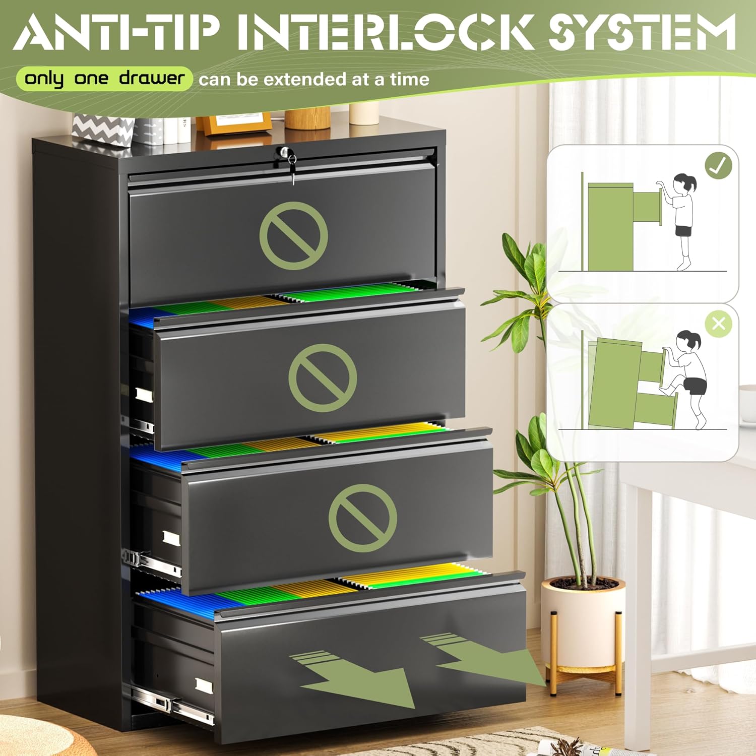 - 【High security】Four-drawer file cabinet with Lock is equipped with a built-in interlocking system to ensure drawer security. One locks with two keys ensures that your files are safe and easy to manage. The cabinet with drawers can be locked into four drawers at the same time with a lock, which is smooth and easy to operate.