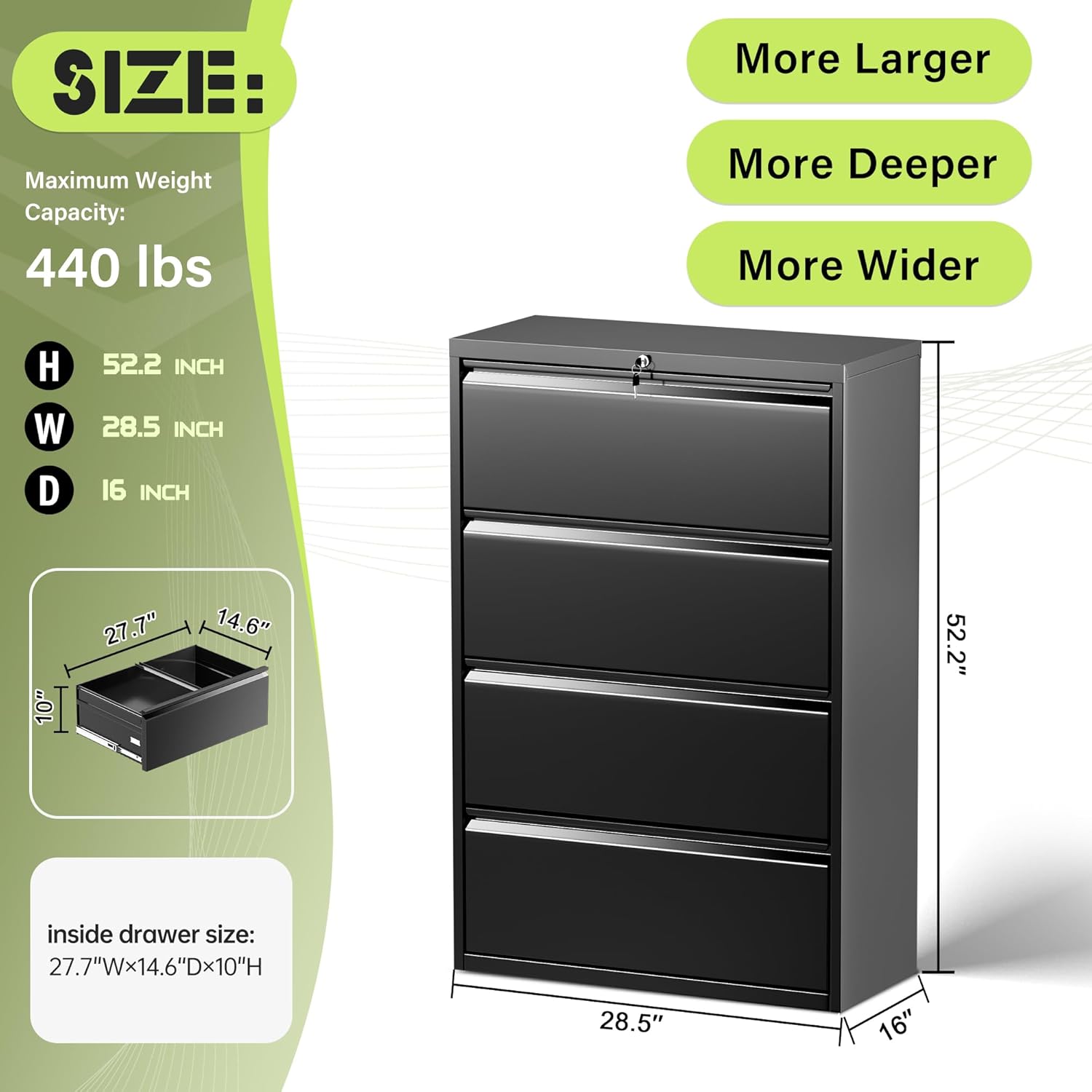 - 【Unique design】Lateral file cabinet is fully suspended drawer system with ball bearings makes the switching operation easy and noiseless, which it friendly for others to work with and always keeps a quiet environment. Non-mar padded base prevent from sliding and scratching floors.