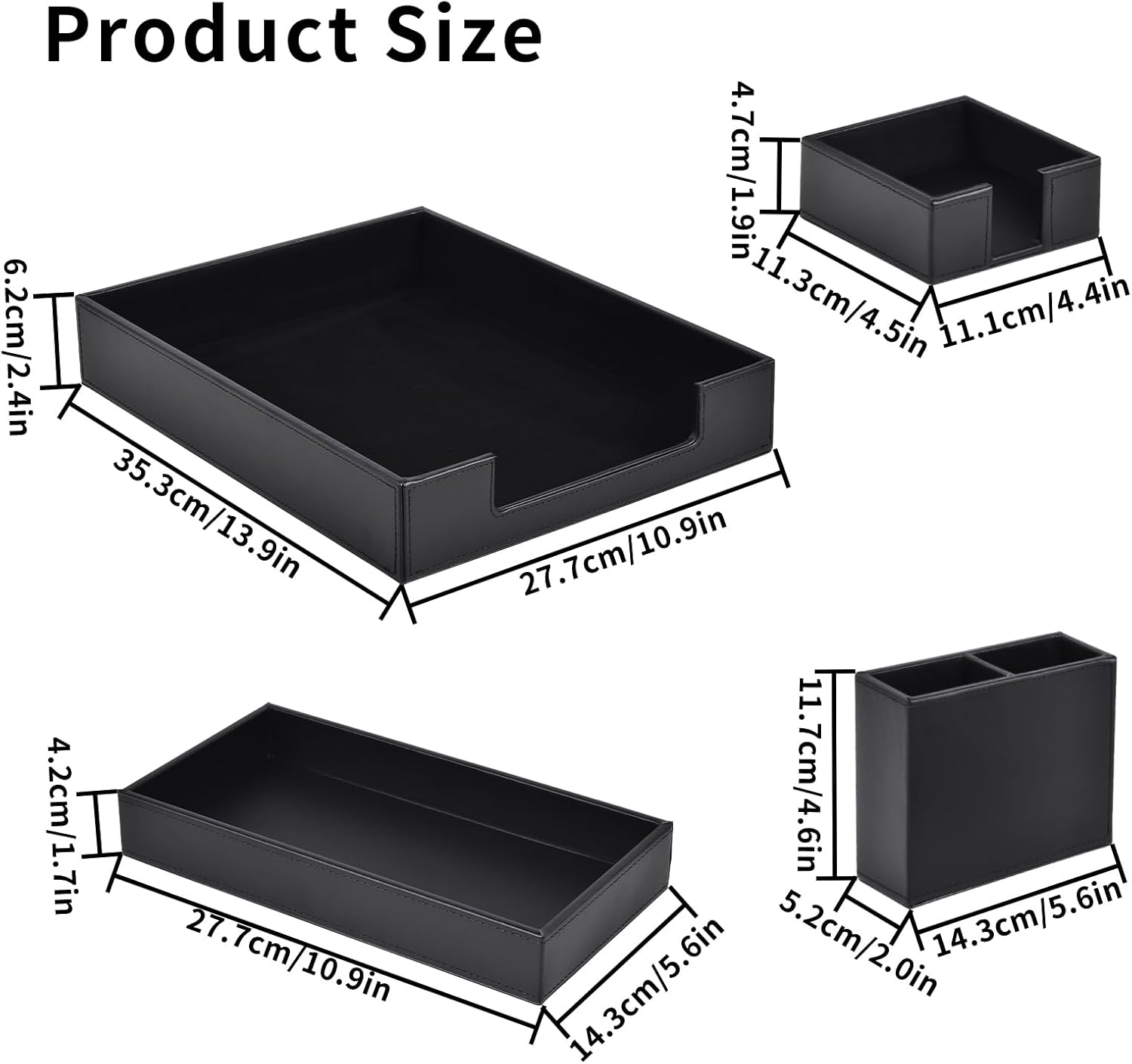 4 Pack Leather Office Supplies/Desk Organizer for Letter Paper Tray,Sticky Note Holder,Pen Cup,Stackable Small Letter Mail Sorter Tray,Workspace Decor for Women Men (Black, 4-piece set)