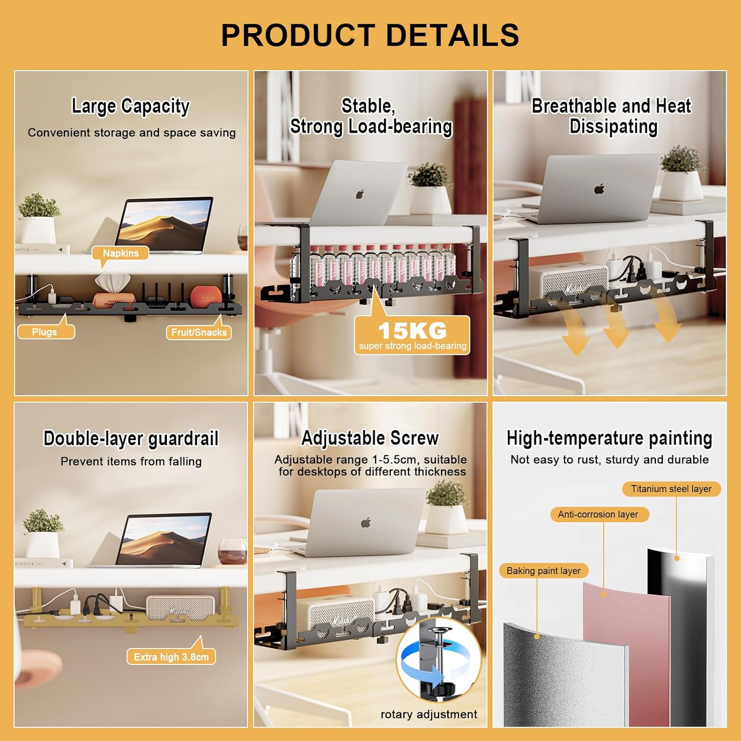 - 【Space Saving & Keep Organized】Our cable management tray under desk will help you hide all power cords, socket boards, USB hubs, and computer transformers under the desk. No more hanging or tangled wires and creat a tidy external environment and a harmonious internal environment, thereby enhancing your work efficiency. In addition, the tray can also be used as storage rack in kitchens and study rooms, for storing seasoning bottles, books, pen holders, and other items.