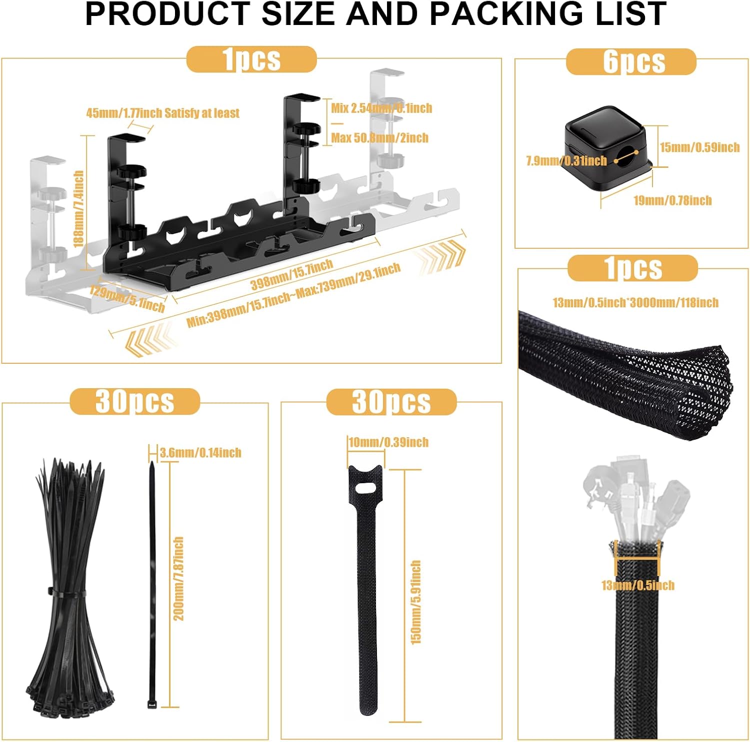 - 【Cable Management Tray kit with 10ft - 1/2 inch Braided Cable Sleeve】Our Cord management under desk is made of high-quality carbon steel, which is sturdy and durable. Multiple accessories are included. Package list: 1x Extendable Cable Management Tray; 1x 10ft Braided Cable Sleeve; 30x 8" Black Zip Ties; 30x T-shape Reusable Cable Ties; 6x Magnetic Cable Holder. These reusable accessories equipped can better help you organize messy cables and other household items.