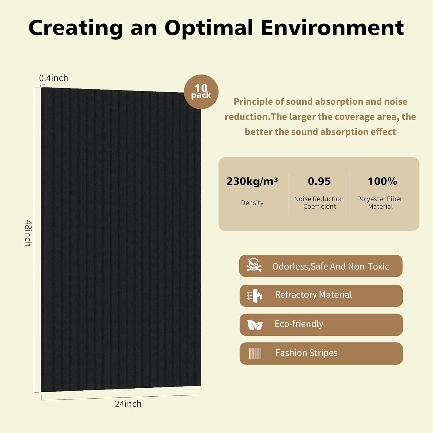 - HIGH DENSITY: Wall soundproofing panels have a density of 230kg/mΒ³ and are made of 100% polyester fiber, which is wear-resistant and durable. Ideal for use anywhere in your home or studio. The polyester fibers are dense and uniformly stiff, and their sound absorption properties remain consistent. Helps reduce background noise, echoes, and reverberation time (RT), and reduces standing waves and float.
