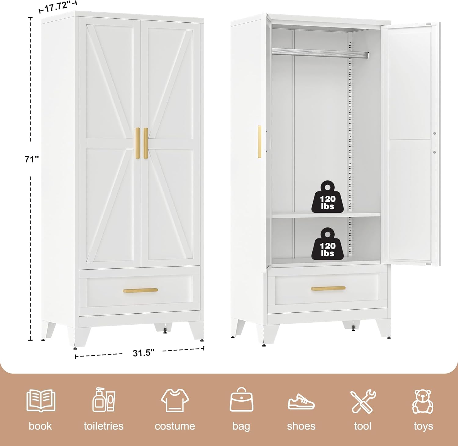 71" Tall Metal Wardrobe Cabinet with Drawer and Hanging Rod, 2 Doors Armoire Wardrobe Closet with Shelf for Bedroom, Office, Laundry Room, White