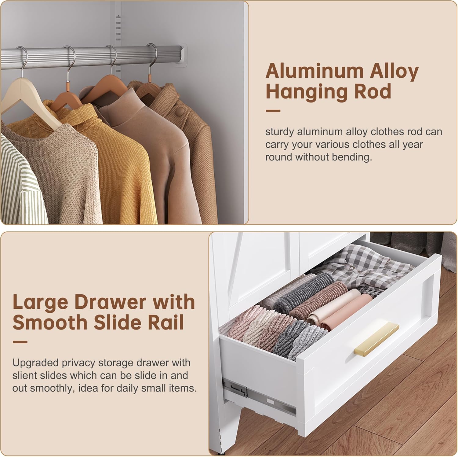 - Convenient Drawer Design: The bedroom armoire includes a spacious drawer at the bottom, providing storage space for smaller items such as underwear, socks, or others. The smooth glide system ensures a hassle-free opening and closing