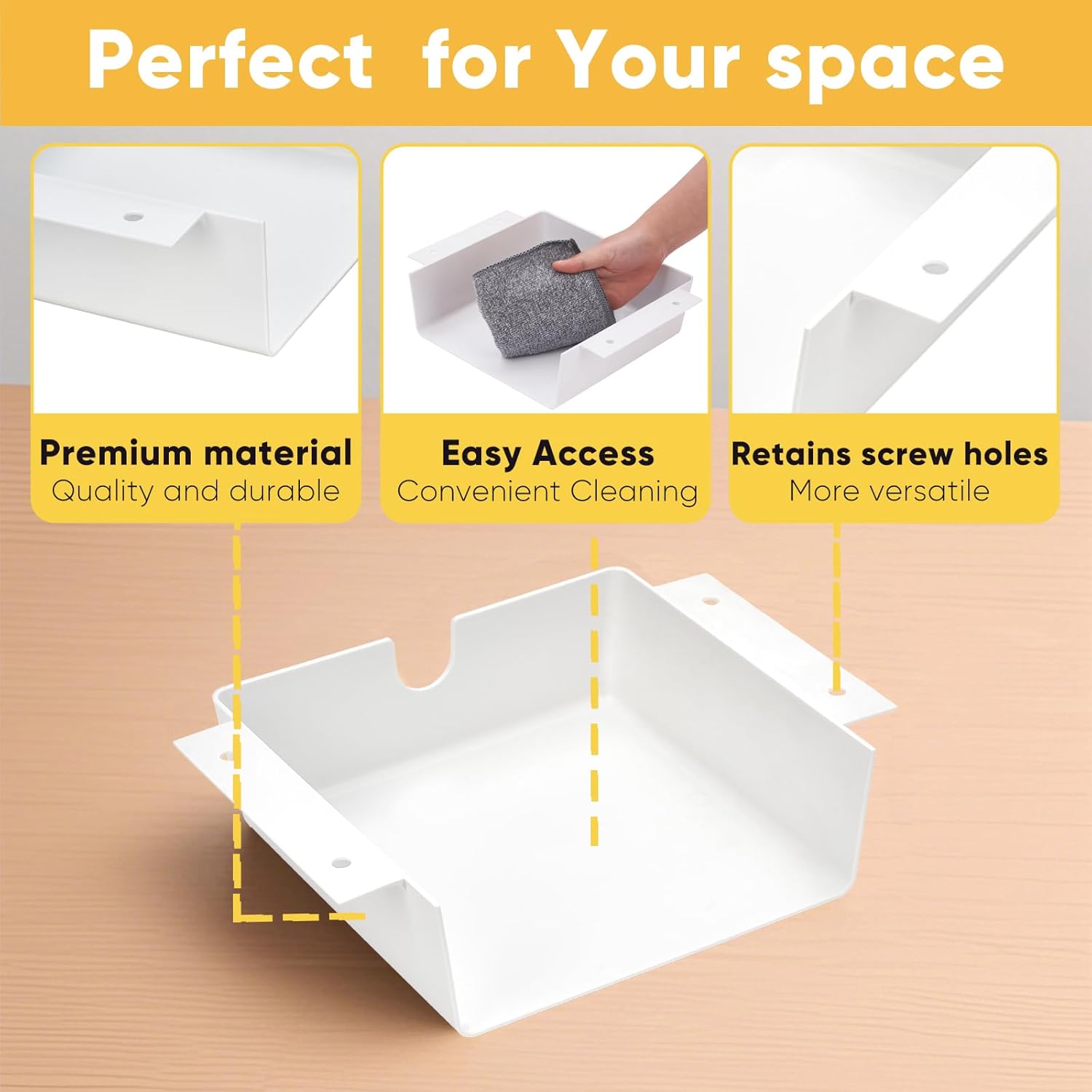 2 Pack Under Desk Hanging Shelf Drawer Organizer, Attachable Plastic Hidden Storage Tray, Easy Adhesive Mount Holder for Standing Tables, Office, Counters, Cabinets, Workstations - White