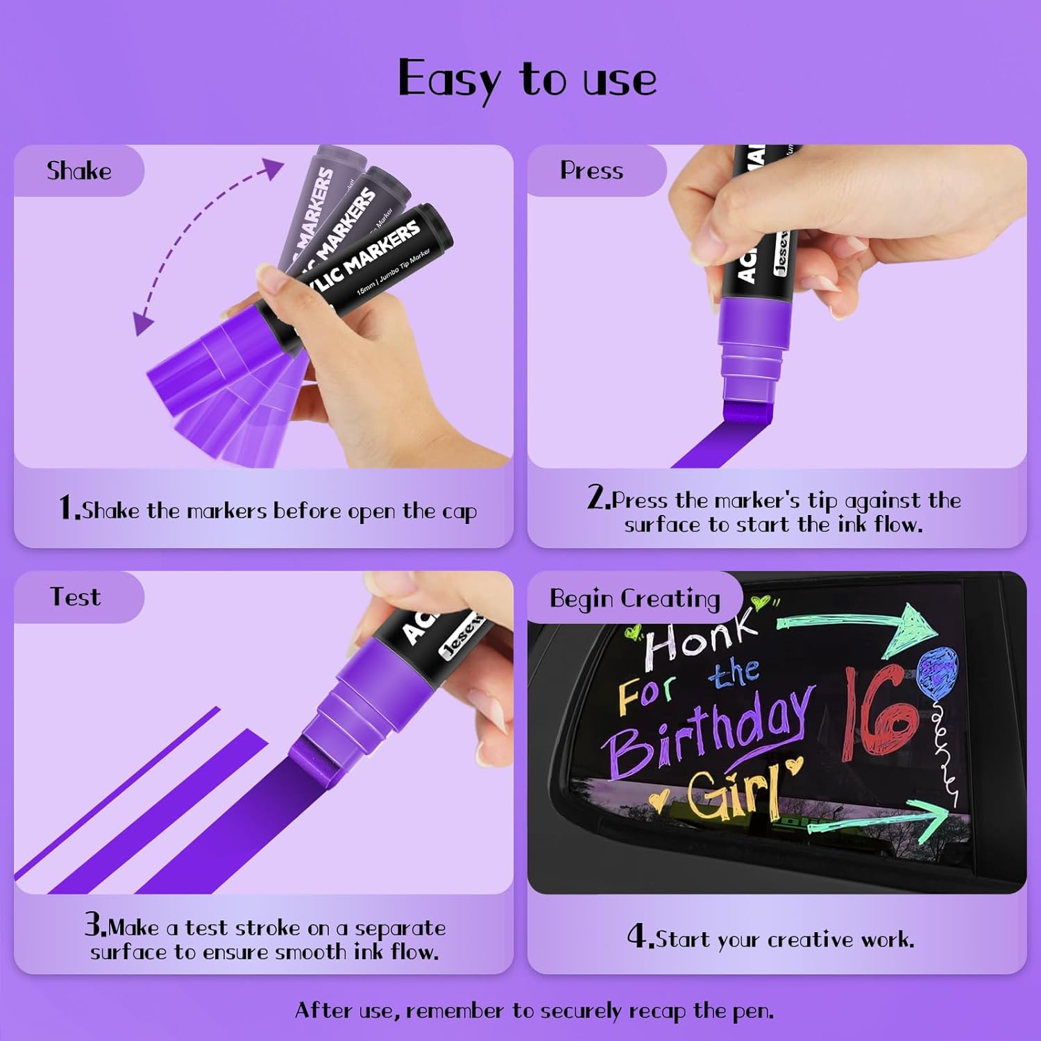 - Versatile Multi-Surface Use: Achieve picture-perfect artwork on nearly any surface with these versatile markers. Whether you're working on posters, DIY projects, or other creative endeavors, these acrylic paint markers excel on surfaces such as walls, stone, ceramic, glass, wood, fabric, canvas, plastic, textiles, metal, resin, terracotta, seashells, polymer clay, vinyl, leather, and more.