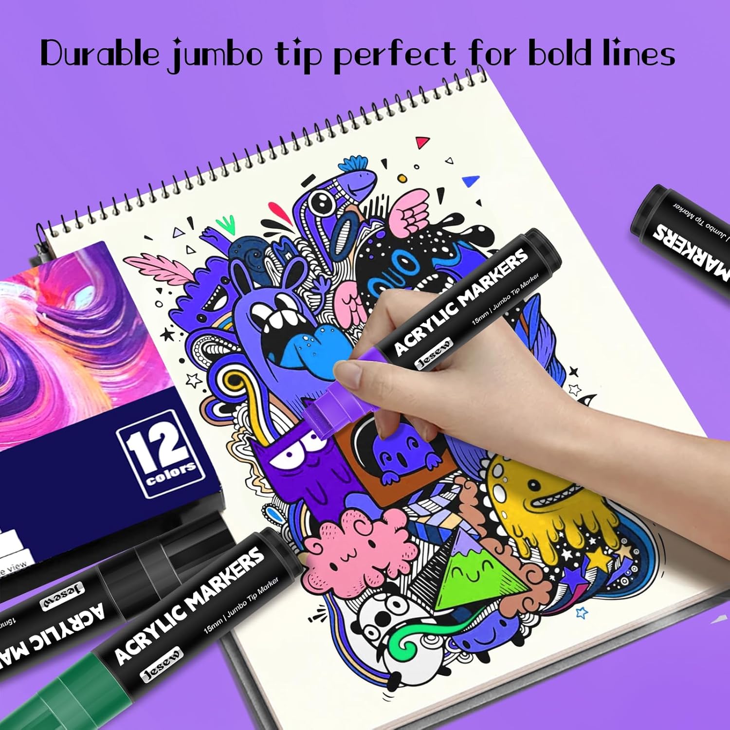 Acrylic Paint Markers, 12 Colors Jumbo Markers, 15mm Jumbo Felt Tip, Waterproof and Permanent Ink Paint Pens for Rock Painting, Stone, Ceramic, Glass, Wood, Canvas, Poster, Signs