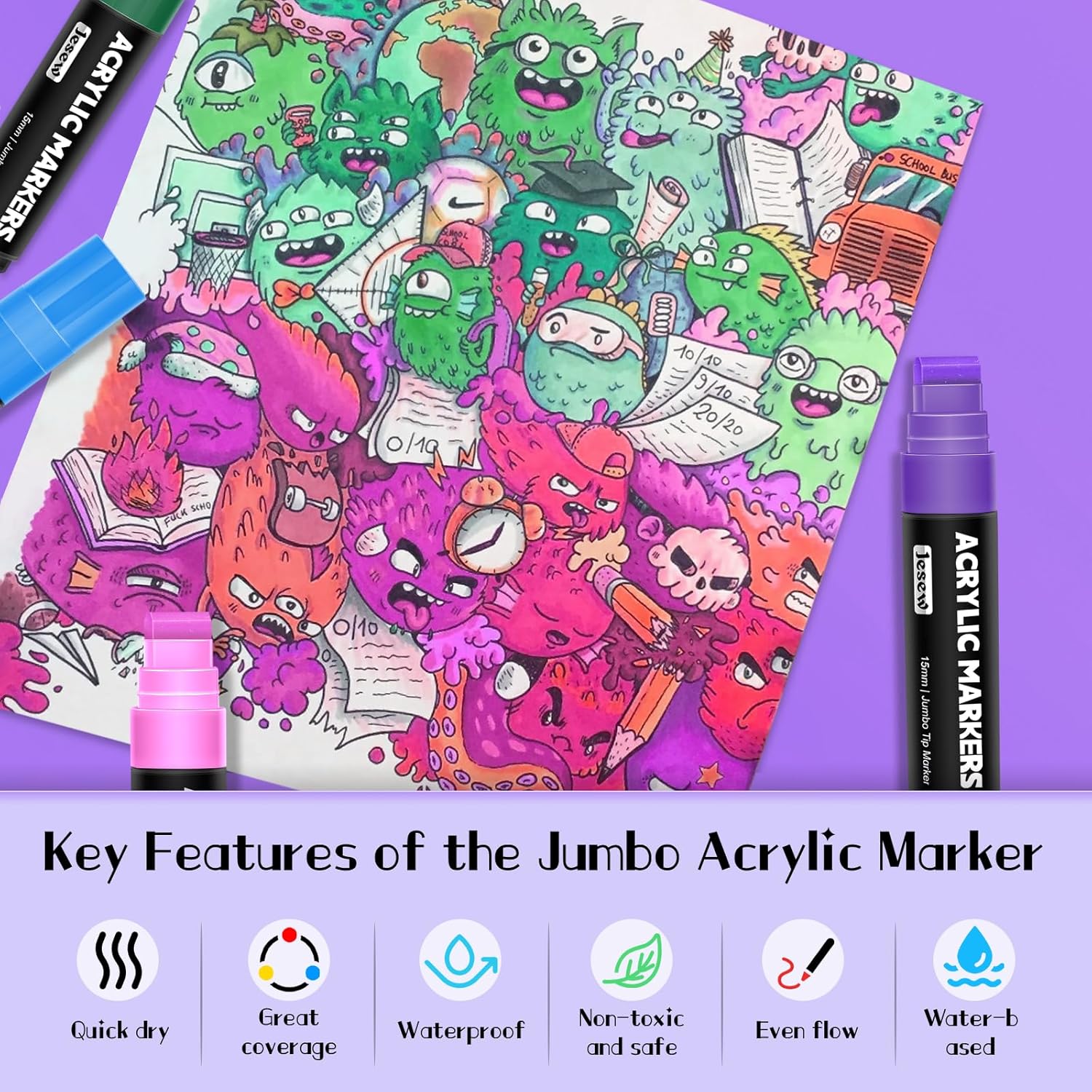 - Durable Jumbo Tip: Jesew Jumbo Markers feature a robust 15mm jumbo nylon nib, ensuring long-lasting performance. Crafted with high-quality water-based acrylic ink, these waterproof permanent markers maintain the tradition of high art calligraphy, offering reliability and excellence.