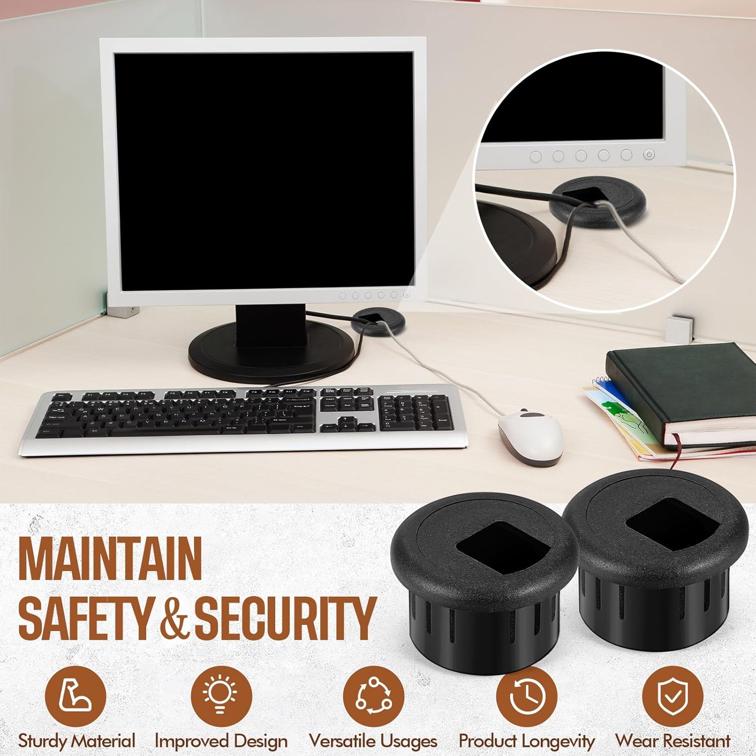 - Desk wire organizer grommet: allow you to pass cords through the top of desks orderly, creating a organized look and keeping the cords more tidy in desktops and work areas