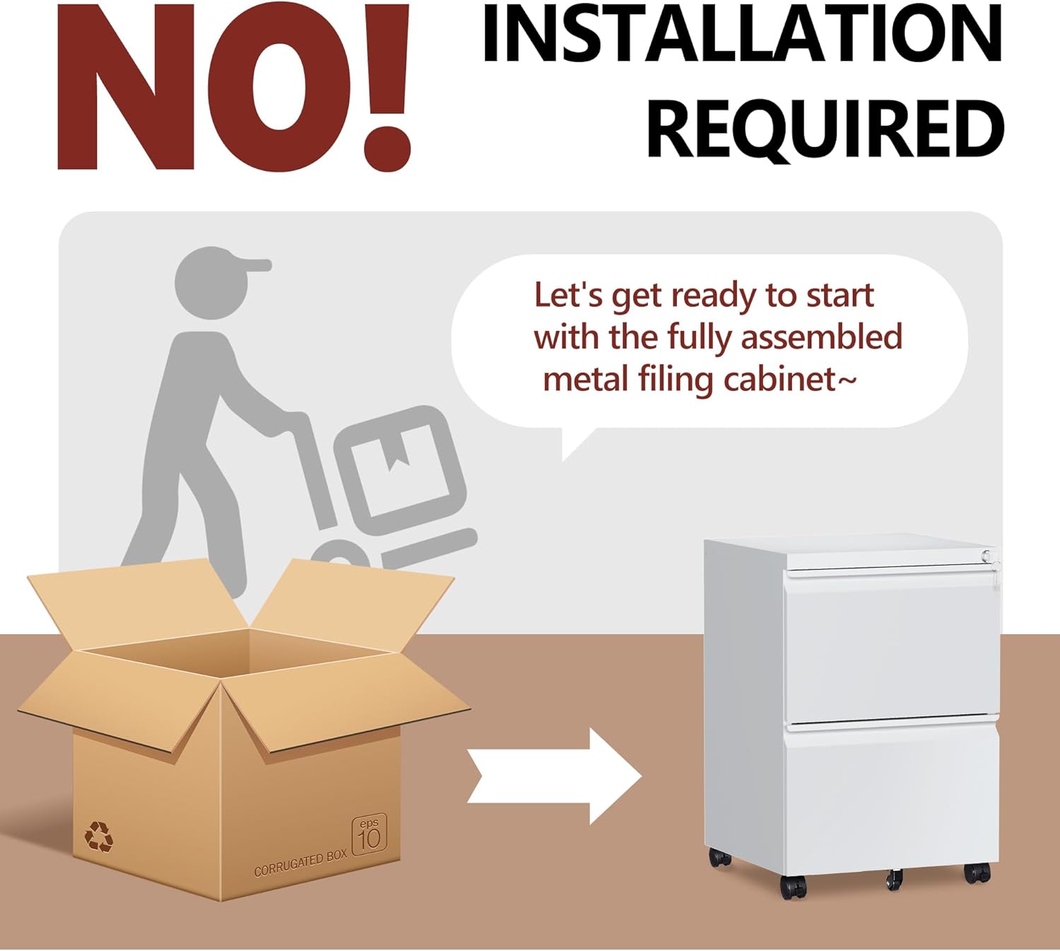 2 Drawer File Cabinet,Mobile Filing Cabinet with Lock and Wheels,Fully Assembled Metal Under Desk File Cabinets for A4/Letter/Legal Size(White