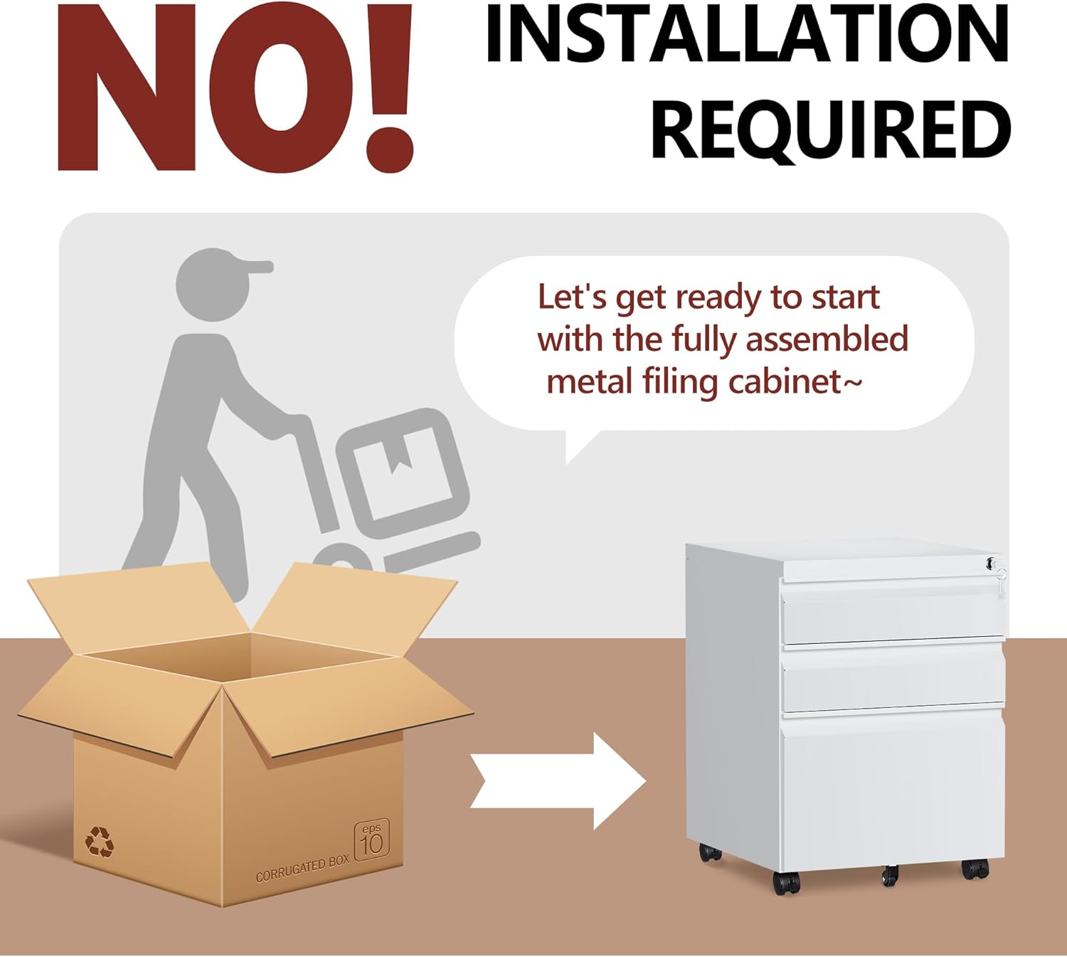 3 Drawer File Cabinet,Mobile Filing Cabinet with Lock and Wheels,Fully Assembled Metal Under Desk File Cabinets for A4/Letter/Legal Size(White