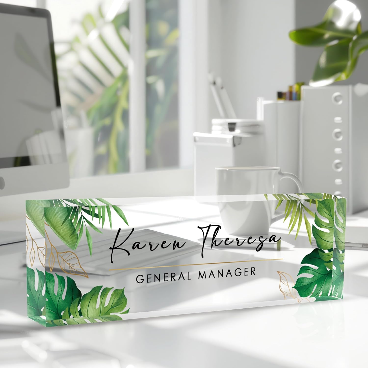 Custom Office Name Plate, Personalized Gifts for Women & Men, Appreciation Gifts for Employees, Office Desk Accessories (Green Plants)
