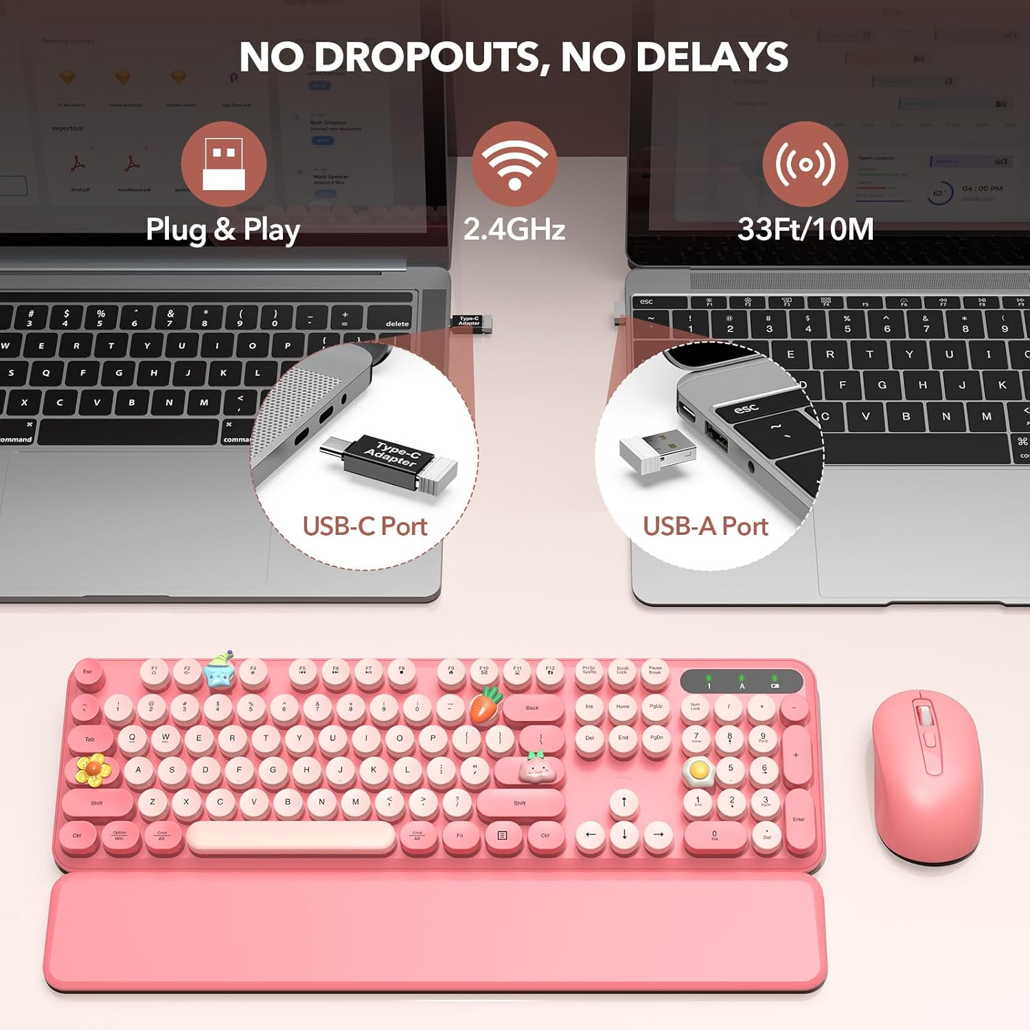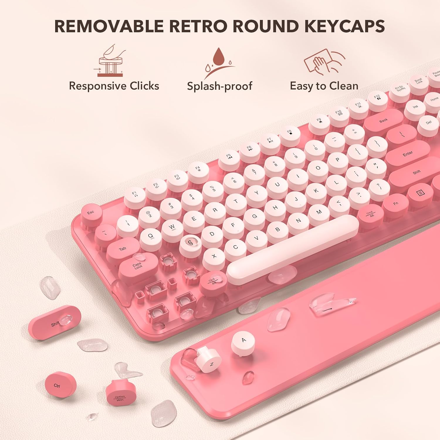 Wireless Keyboard and Mouse Combo - Retro Keyboard with Round Keycaps, Full-Size Typewriter Keyboard with Detachable Wrist Rest, 2.4GHz Connection for Mac/Windows/PC (Baby Pink)