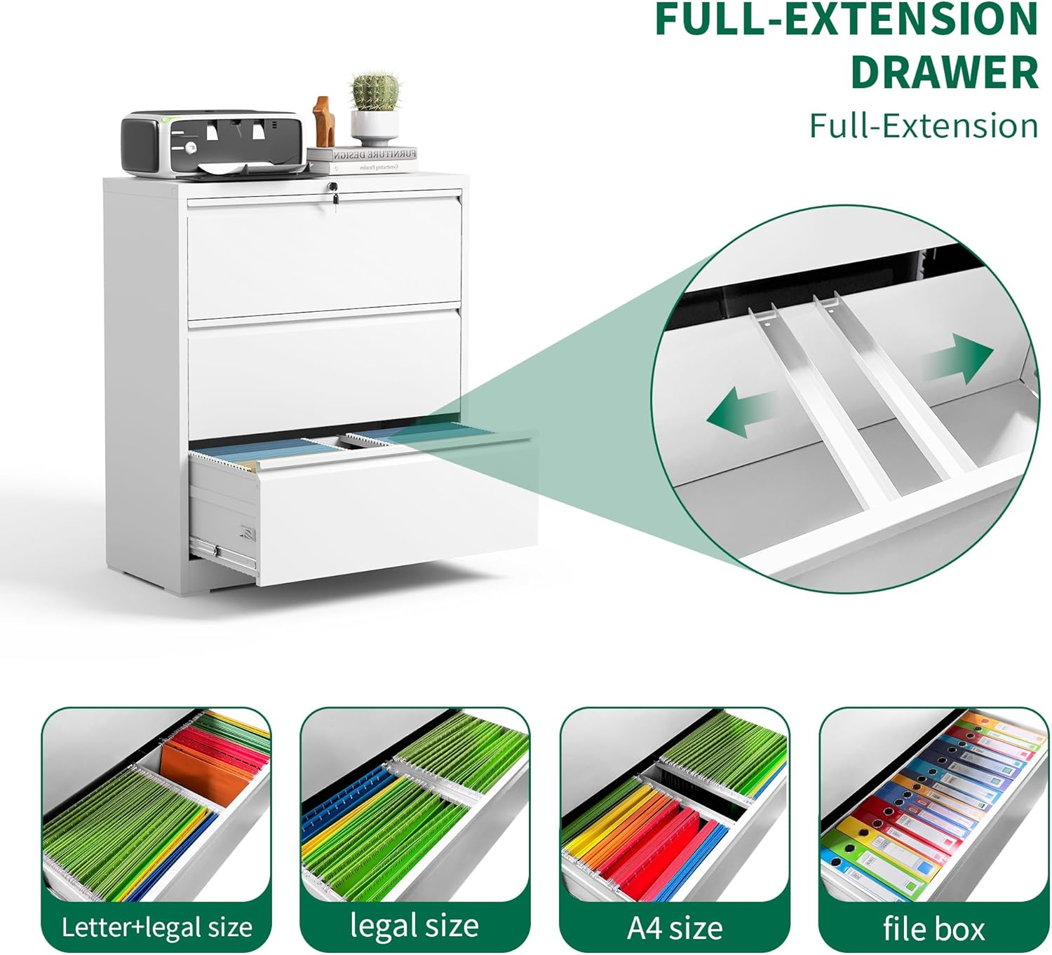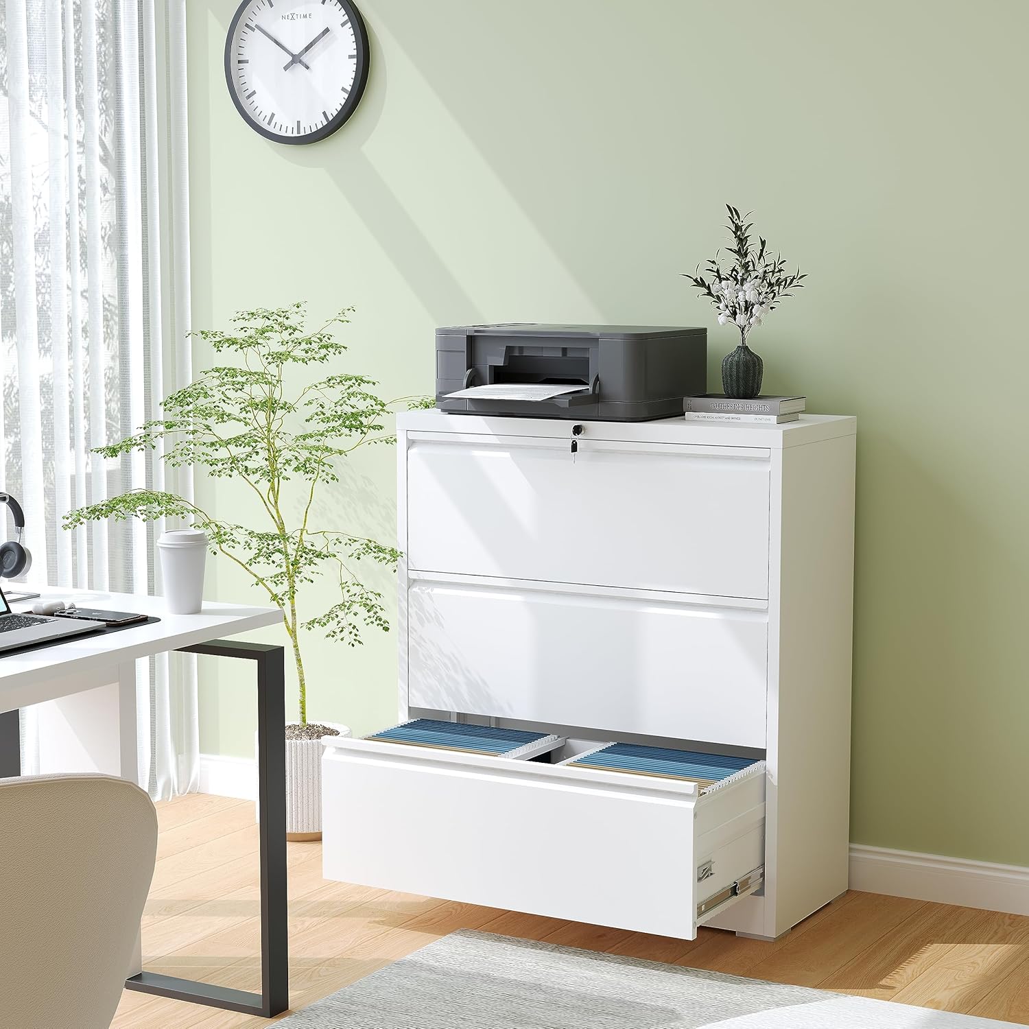3 Drawer Lateral File Cabinet, Metal Filing Cabinets for Home Office, Steel Storage Wide File Cabinet for Letter/Legal/F4/A4 Size with Hanging Bars, Assembly Required (White)