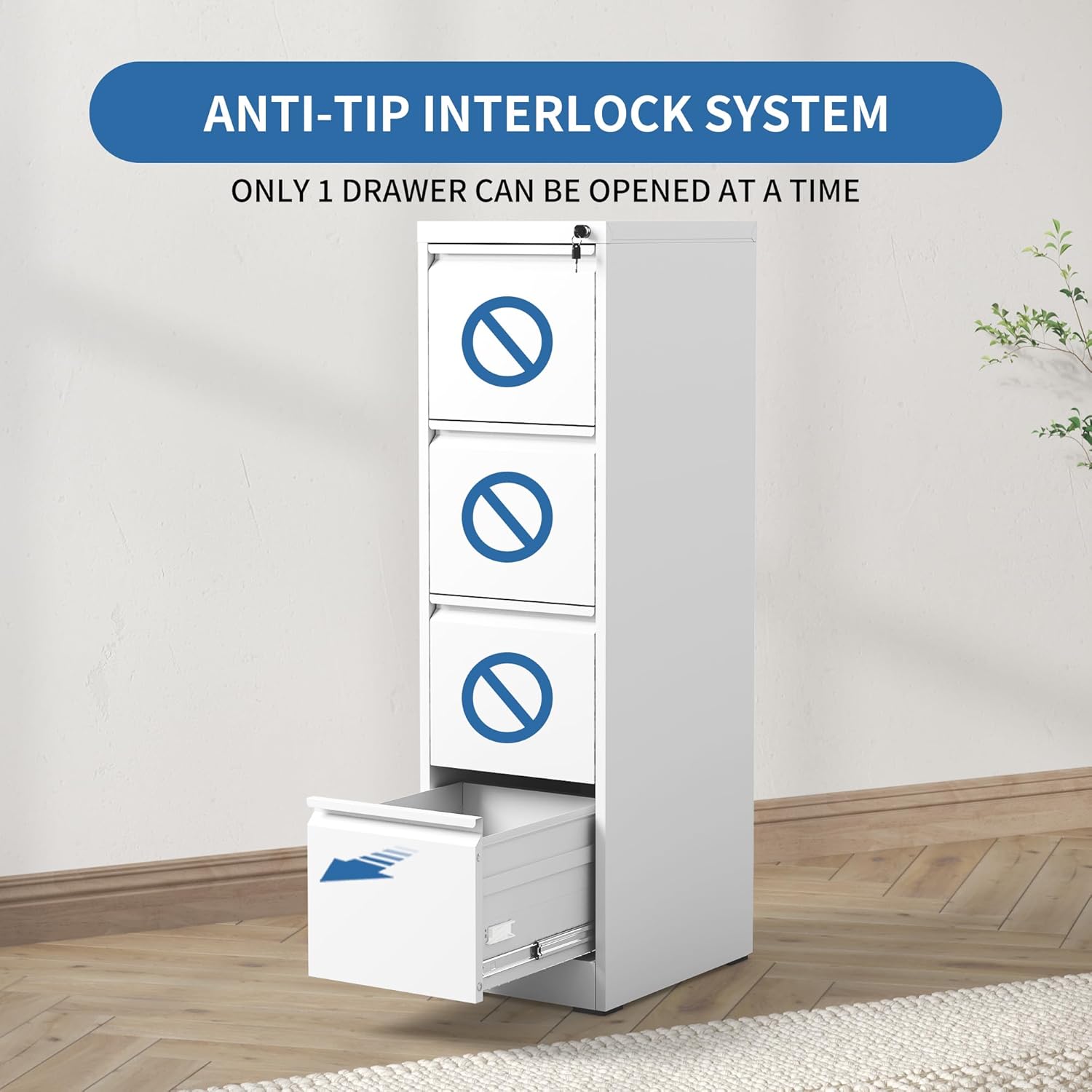 - 【Secure & Anti-tilt Design】Our office filing cabinets with 4 drawer feature a locking mechanism and anti-tip feature. When one drawer is opened, the interlocking drawer system prevents the other drawers from opening, preventing tip-overs and increasing safety.