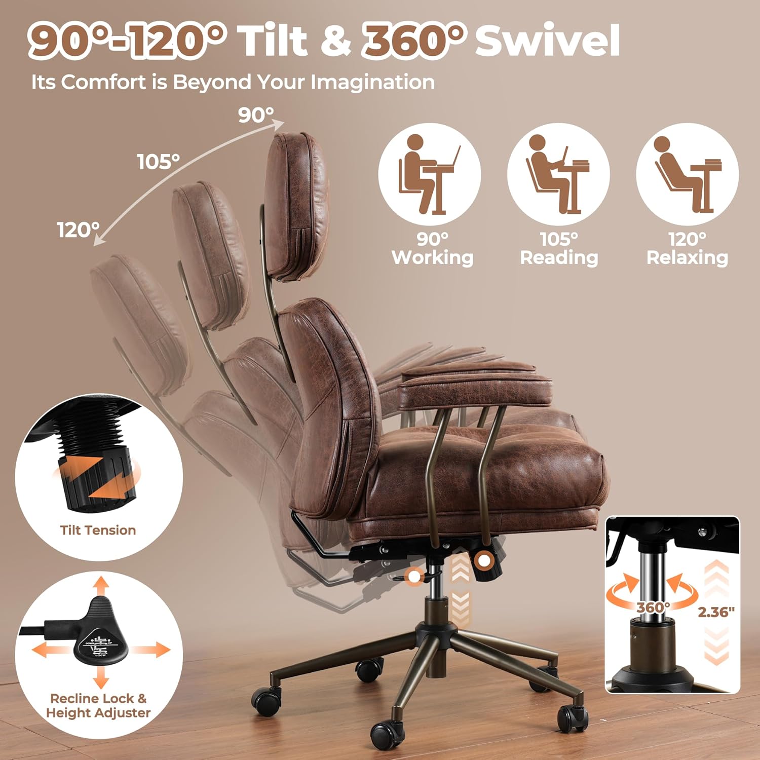 - Comfy Ergonomic Seat: This luxury executive chair is designed for ergonomics, 90Β° to 120Β° tilt adjustment, to adapt to your various sitting experience, you can adjust the strength of the tilt through the tension, so that you can relax and comfortable to do things, the removable armrests and height adjustment function can be applied to different heights of the desk. 360Β° swivel rotation rolling allows you to move more efficiently
