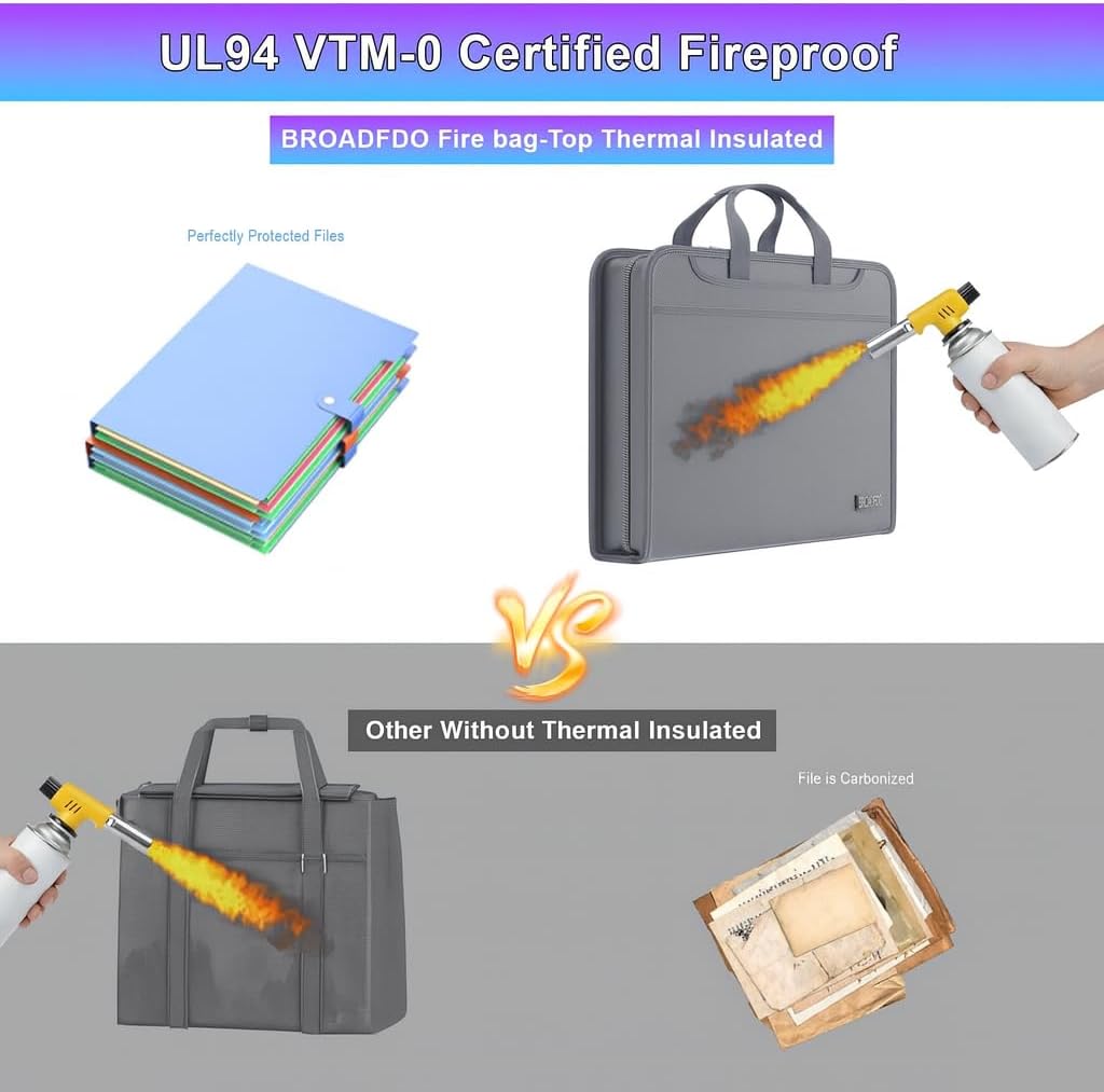 - Ultimate Fireproof & Waterproof Protection for Your Valuables Keep your documents safe with Broadfdo’s fireproof accordion file organizer, capable of withstanding heat up to 5200°F. Its waterproof and dust-resistant coating protects against spills, floods, and wet conditions, making it ideal for emergencies, home, office, and travel.