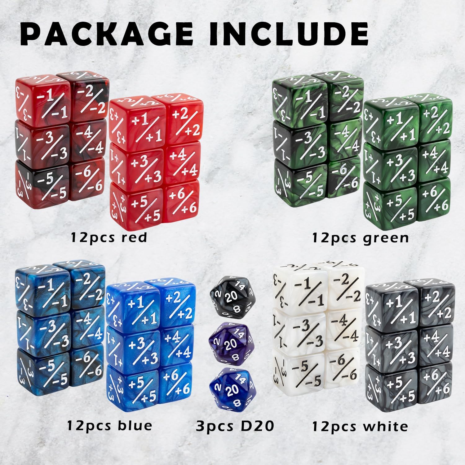 - Package Include: Total 51 pcs mtg dice counters with velvet pouch. Includes 24 pcs +1~+6 counters, 24 pcs -1~-6 dice counters. There are 8 colors, as shown in the figure. They are 0.63 inch/ 16 mm regular D6 dice. There are also 3 pcs 20mm d20 dice.
