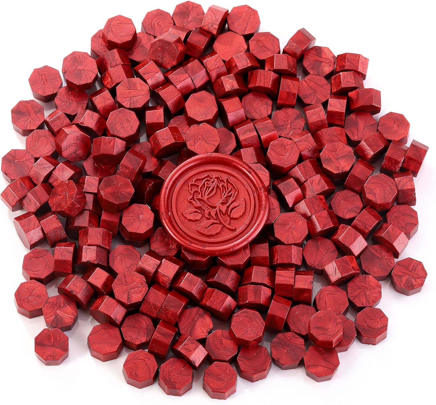 Yoption 300 Pieces Wind Red Wax Seal Beads, Vintage Octagon Wax Seal Beads with 4 Candles and 2 Wax Seal Melting Spoons for Wax Seal Stamps (Wind Red)