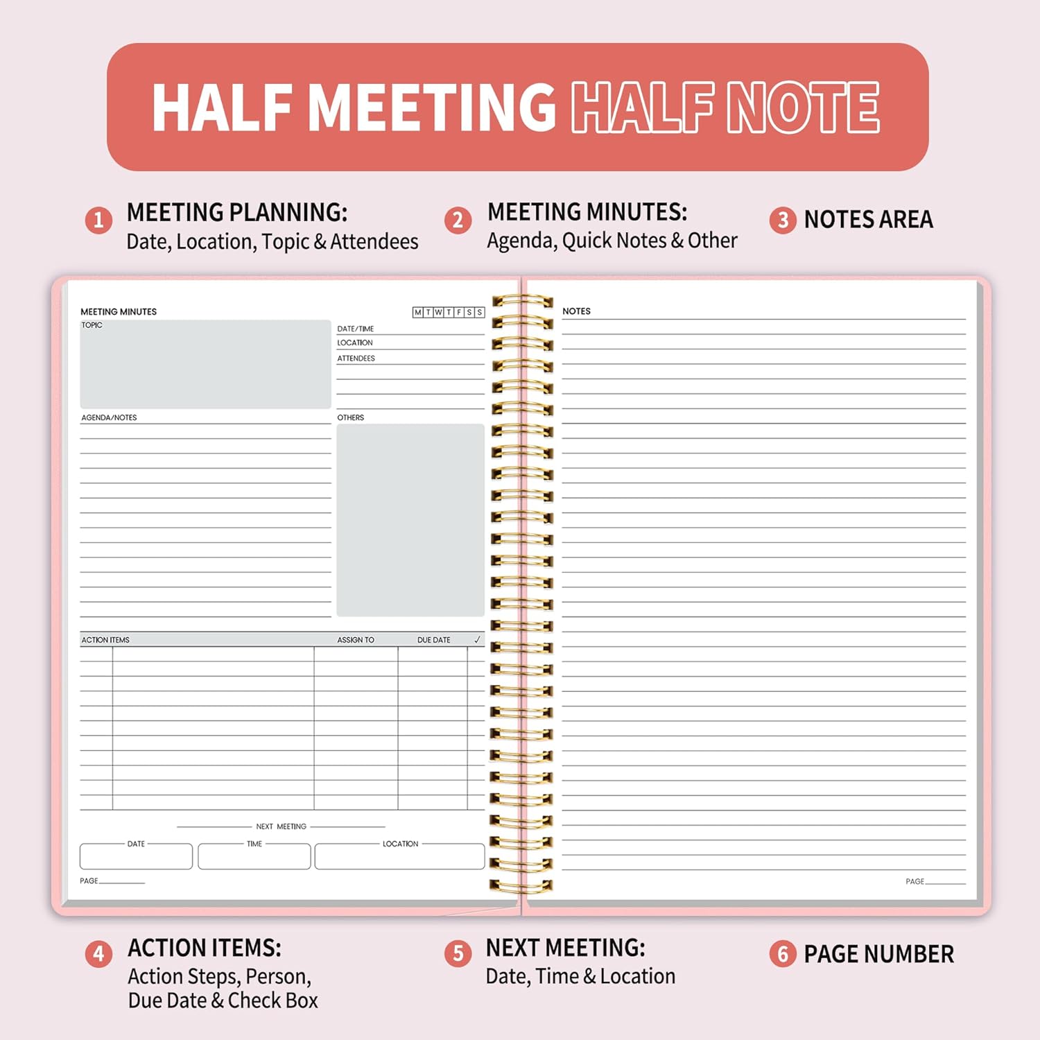 SUNEE Half Meeting Half Note - 7.5"x10" Professional Notebooks for Work - 160 Pages, B5 Size Project Planner, Spiral Meeting Agenda/Minutes Organizer for Women Men, Note Taking, Office & Business