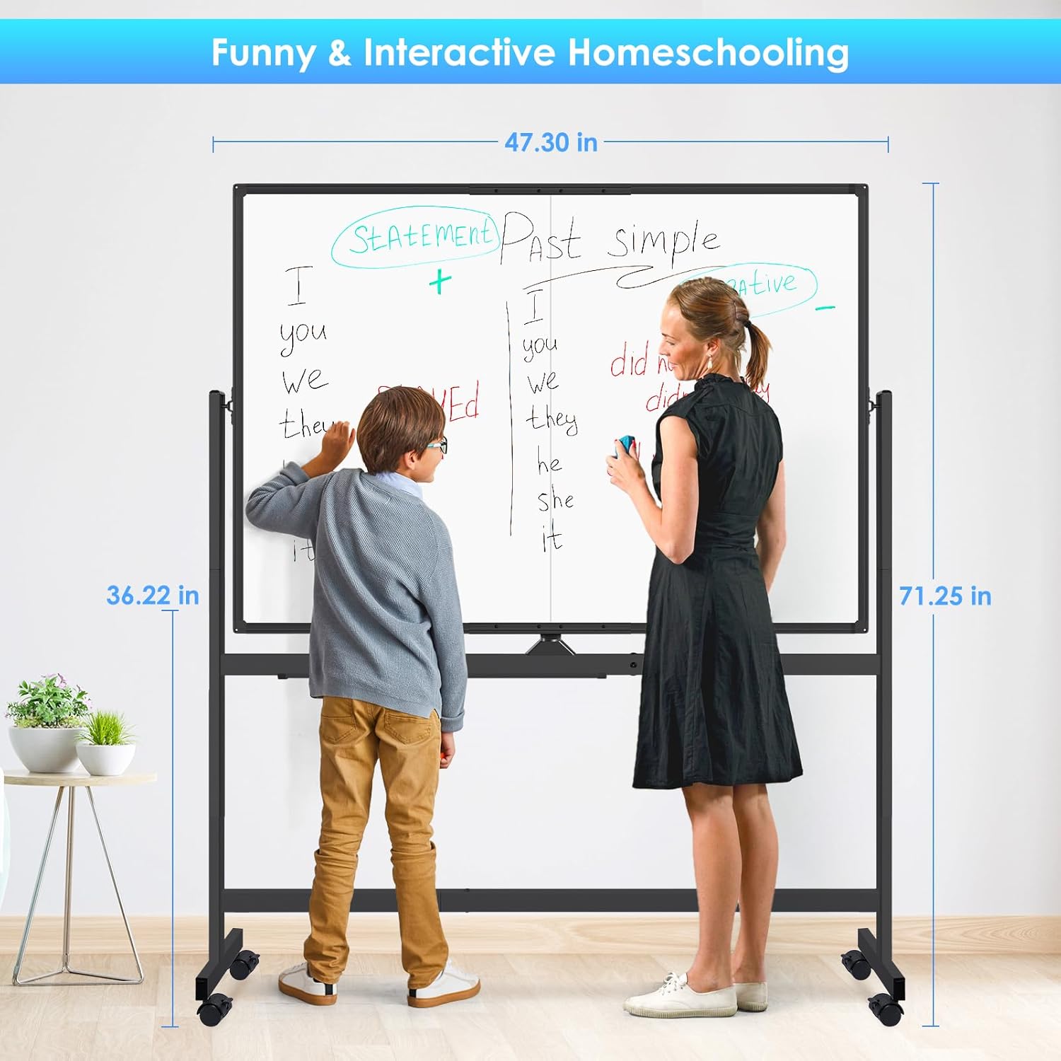 - Easy Rotation & Double Side: maxtek 48βx 36β double-sided white board with stands can easily flip to maximize writing space yet occupy less footprint. Due to its double side, different projects can be carried out simultaneously, like one for family plans and one for kids' painting. It also features magnetic surfaces and a pen tray, allowing accessories to be organized easily