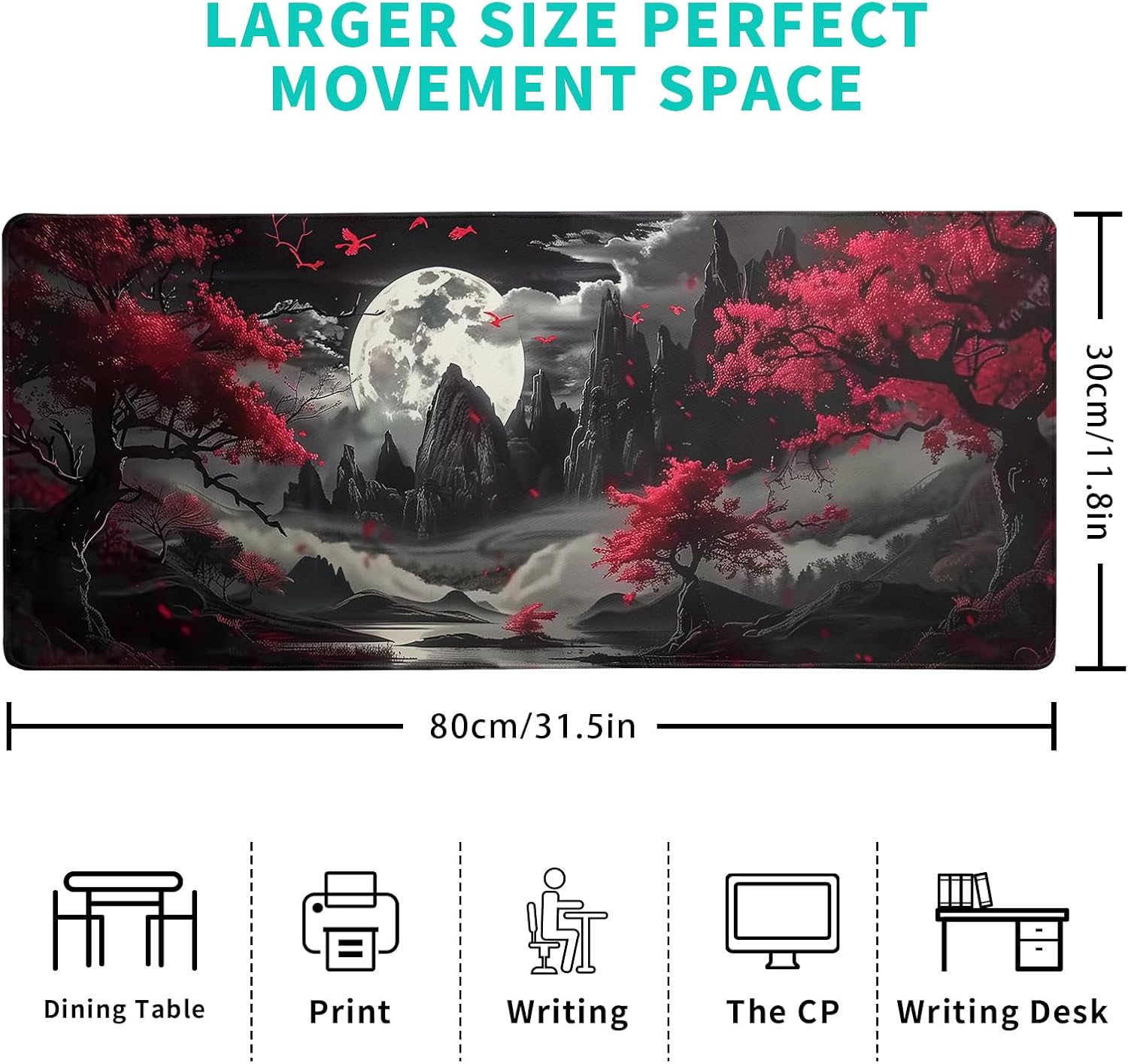 Mousepad 31.5 x 11.8 inches, Large Gaming Mouse Mat with Non-Slip Base, Extended Anime Mouse pad, Full Keyboard Mat with Stitched Edges for Gaming and Office (Red Moon)