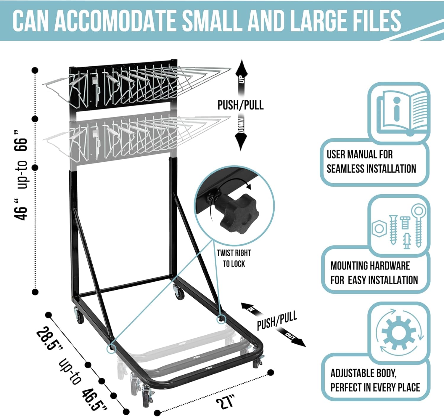 - Mobile and Adjustable Rack: The blueprint rack rolls smoothly on four casters, with front brakes for stability. Height and depth adjustments accommodate different file sizes, making it versatile for various office or jobsite needs.