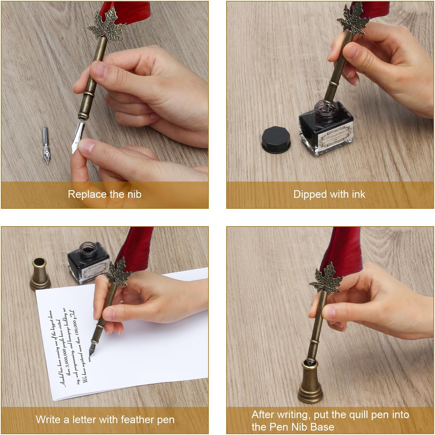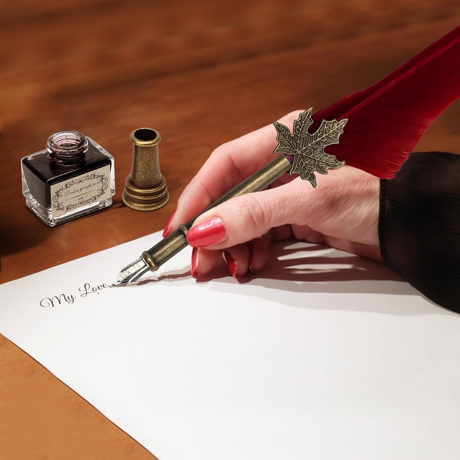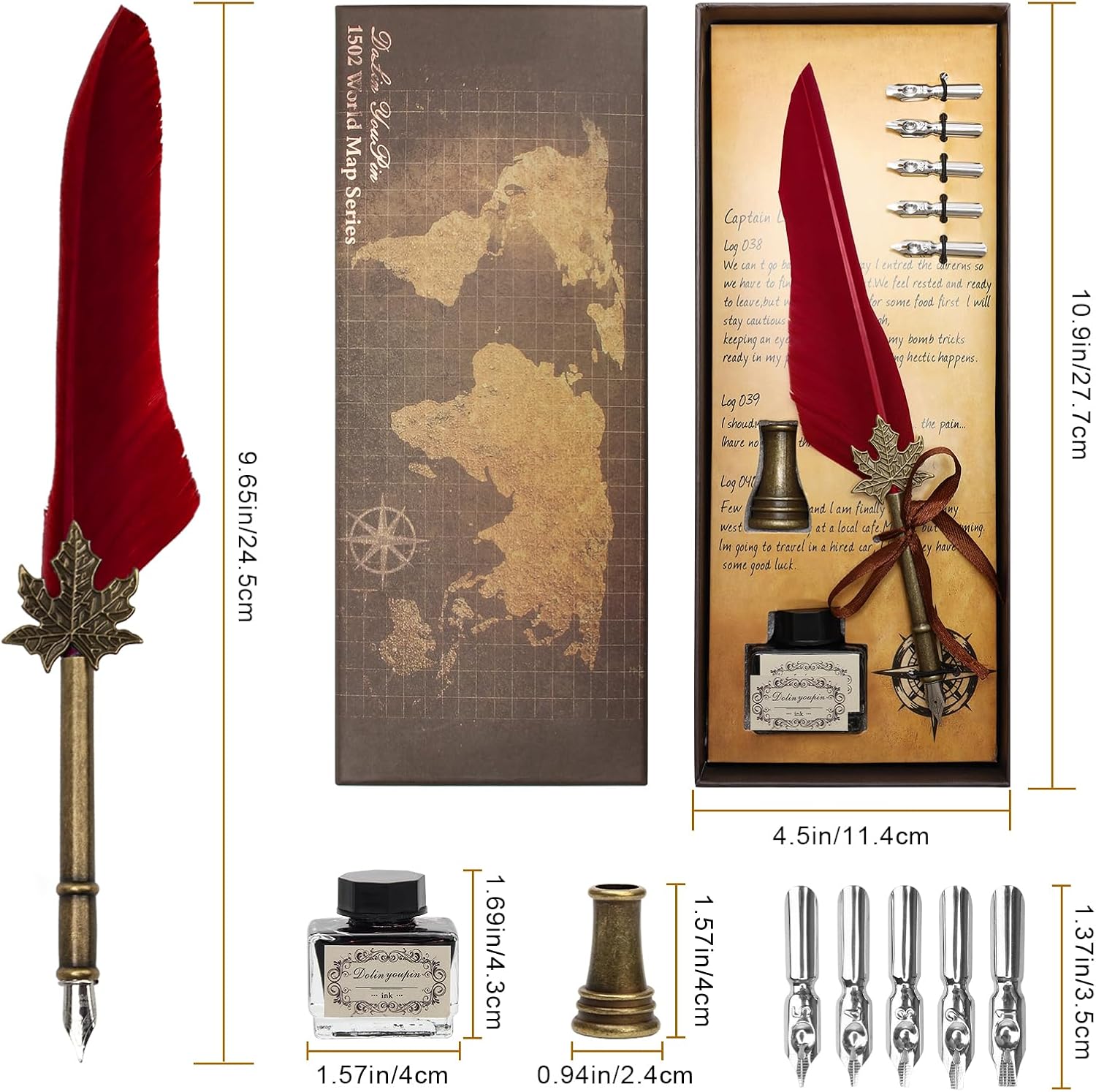 AHIER Quill Pen and Ink Set, Feather Pen Quill Pen Set Includes 5 Steel Replacement Nibs,Pen Nib Base and Dip Ink Bottle for Antique Calligraphy (Red)