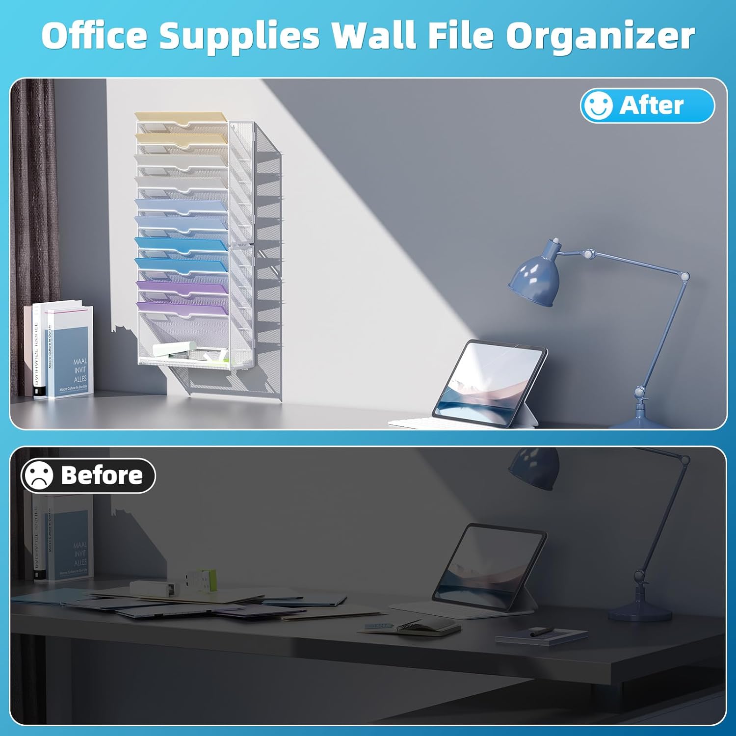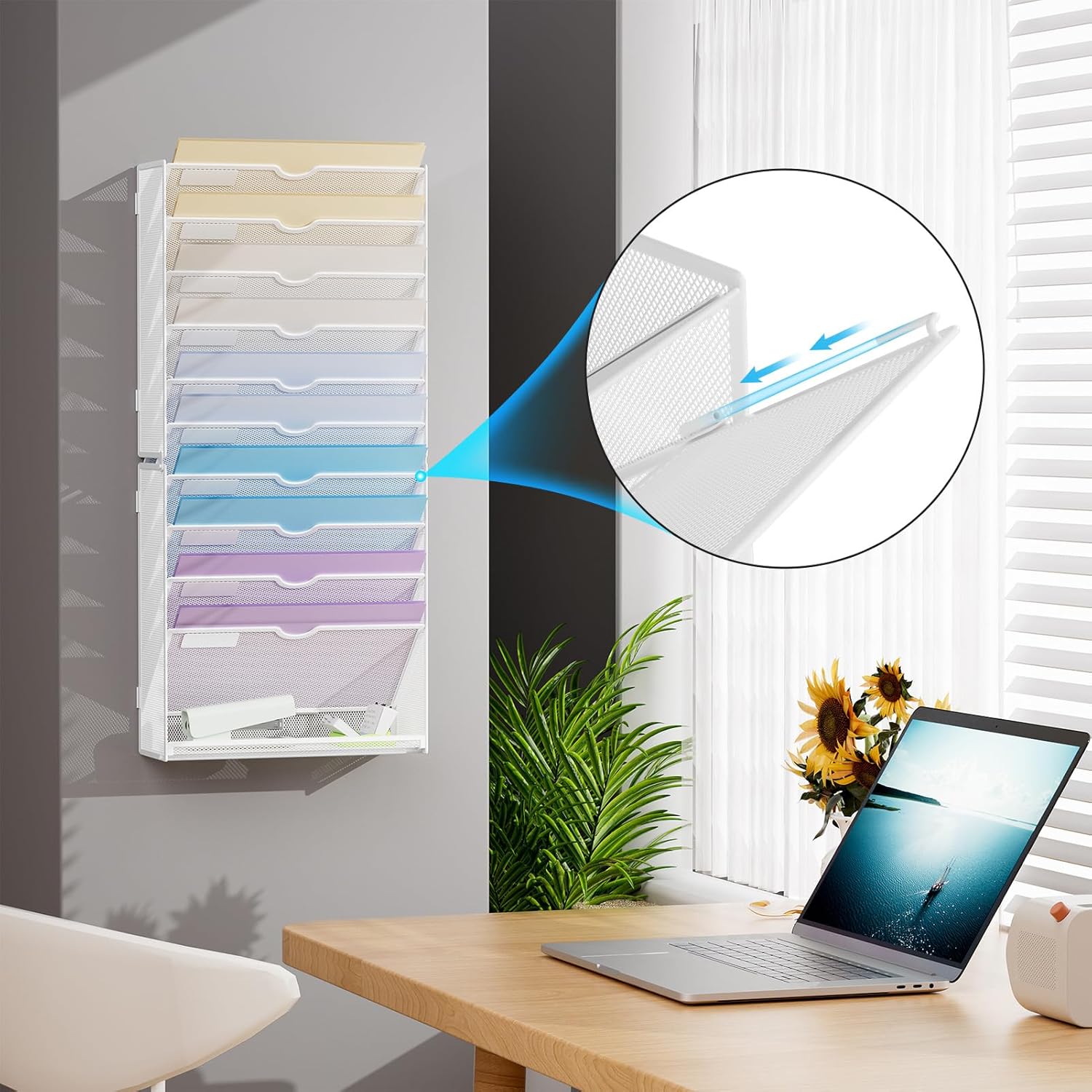 - 【Easy to use】This wall mounted file organizer comes with mounting screws, you only need to drill 2 holes to mount it to the wall. And Our 11-tier wall paper organizer has an elegant look design with upgraded powder coat finish, anti-oxidation and anti-rust, which is enough for many years.