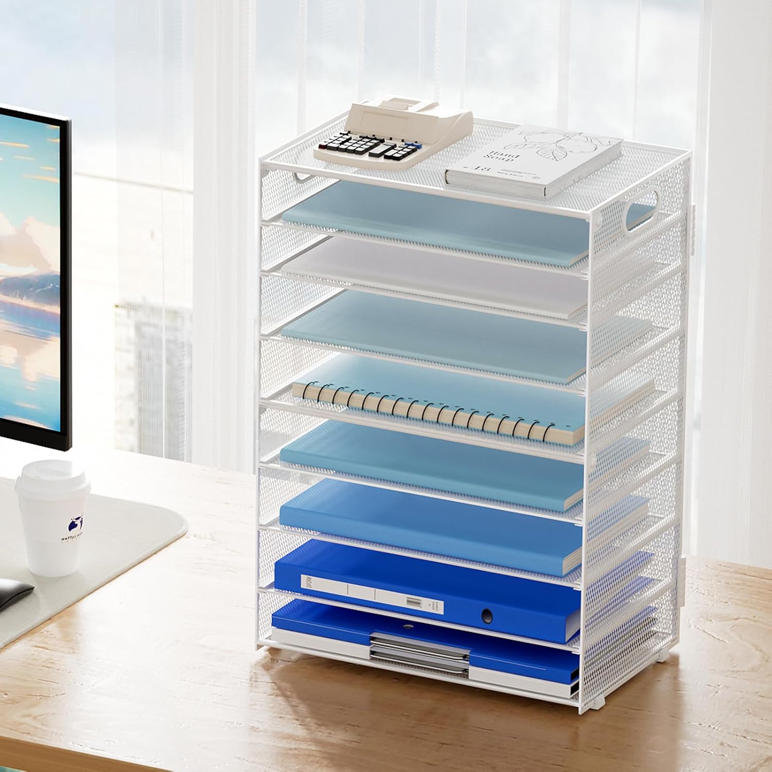 Marbrasse Paper Organizer Letter Tray, 9 Tier Mesh File Organizer with Handle, Paper Sorter Desk Organizer for Home Office Supplies - White