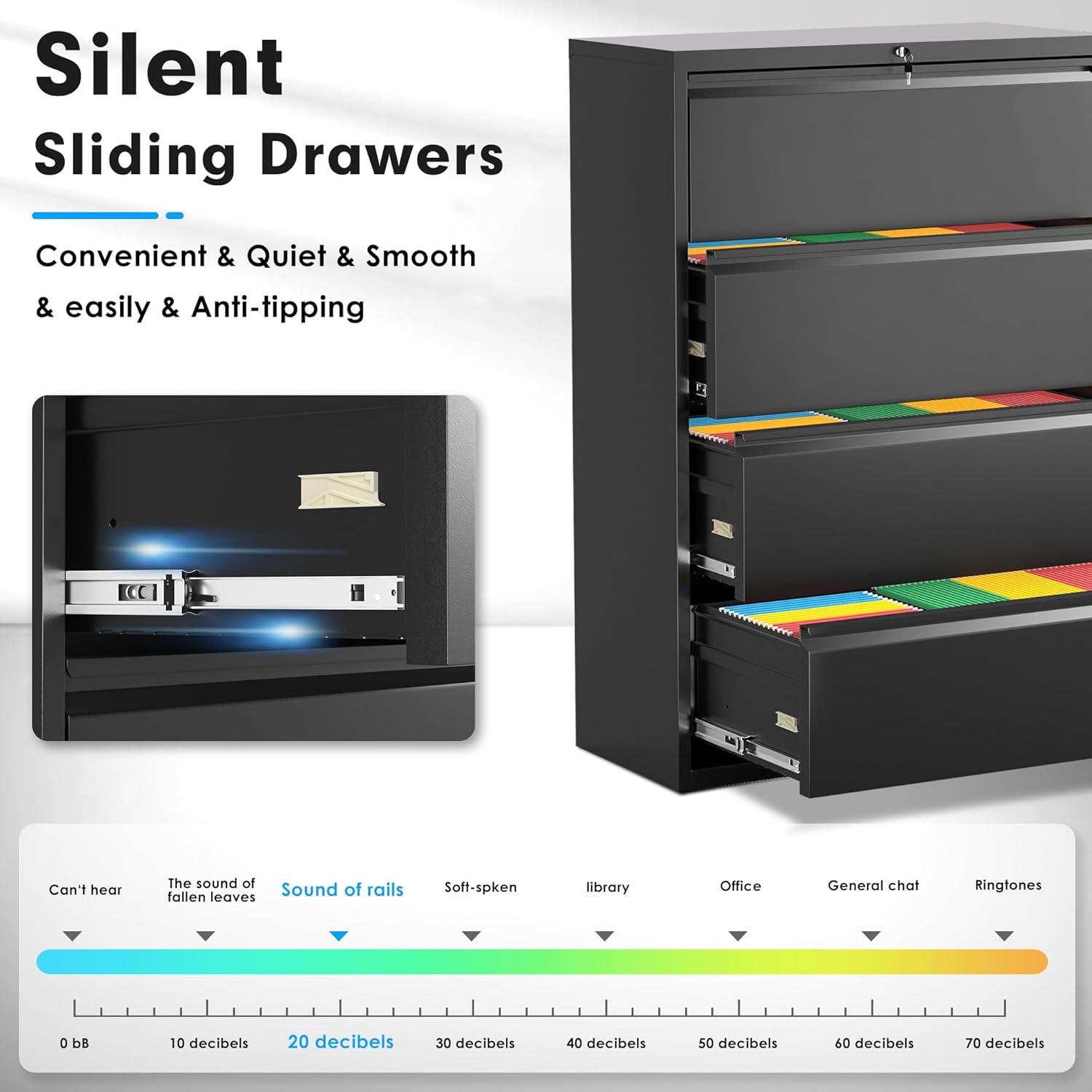 - âčăSmooth ïŒ Silent RailsăPataku 4 drawer black filing cabinets have smooth rolling bearing drawers, which make the sound of pulling the drawers less than 20 dB to maintain a quiet office atmosphere. The hanging rod in the drawer can effectively sort all kinds of files and keep them clean and tidy.