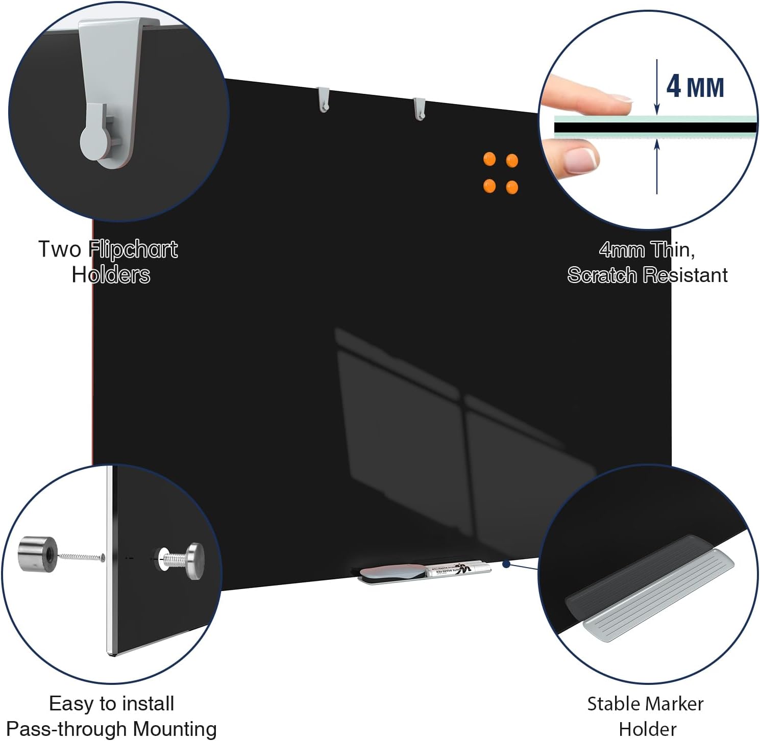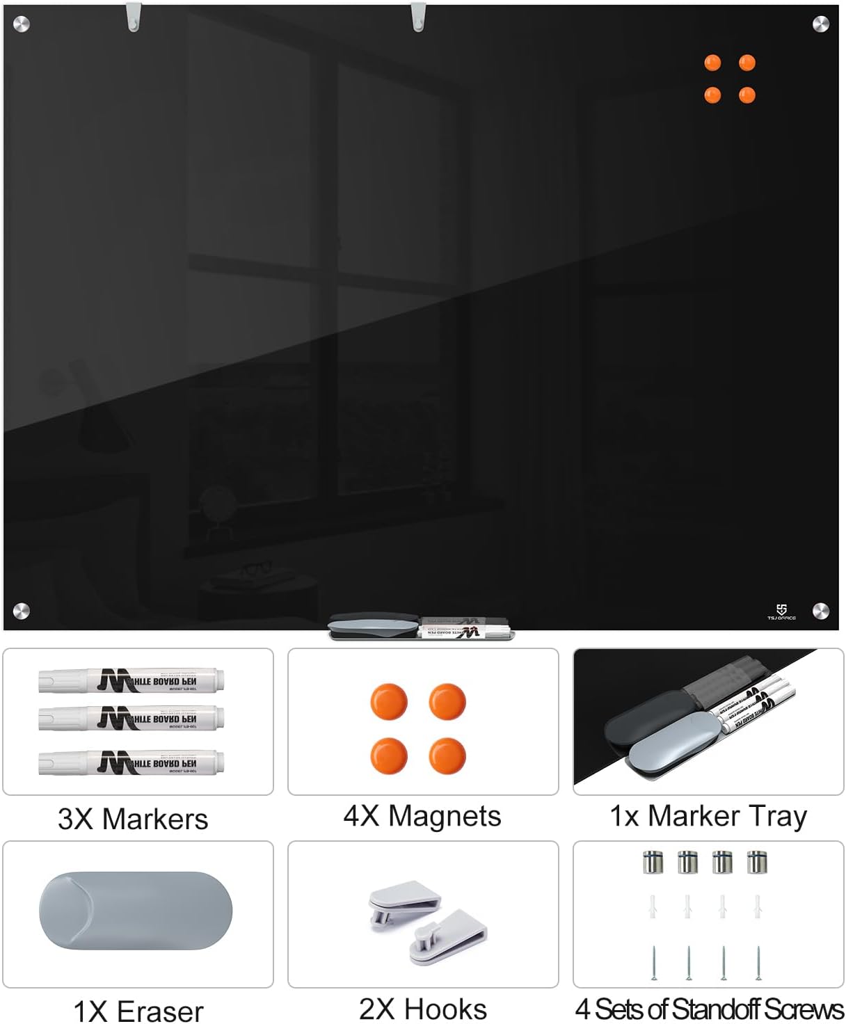 TSJ OFFICE Glass Dry-Erase Board - 48 x 30 Inches Wall Mounted Black Glass Magnetic Whiteboard, Large Frameless White Board for Office, Home & School