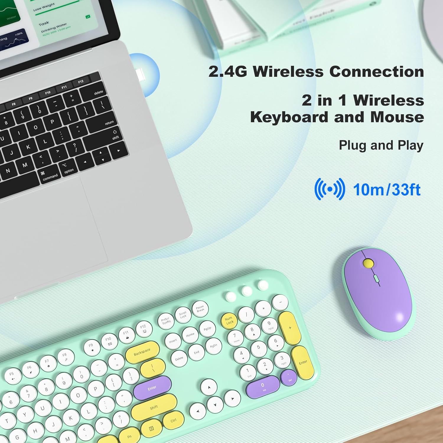 - Wireless Keyboard and Mouse Combo: 104-key colorful keyboard with floating round keys, with foldable stand and anti-slip pad ensures comfortable typing. Optical mice with 3 sensitivity levels provides precise control.